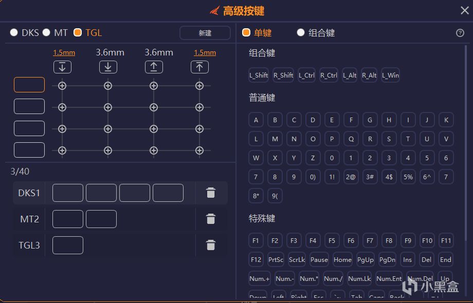 磁轴键盘PCB板上的霍尔元件可以接收到到因永磁体距离不同而带来的不同的磁通量,这就意味着可以进行连续的多段的触发,并且可以通过软件层面的限制实现自定义触发行程,当然了,这些功能都是通过驱动实现的,下载完驱动之后,大家可以设置RT(快速触发),也可以设置一些高级按键:DKS(一段行程多次触发),MT(短按和长按触发不同值),TGL(连续触发)。