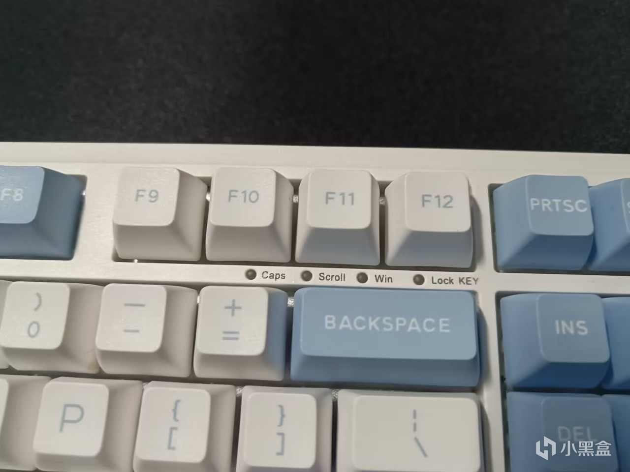 指示灯方面,这次布置的位置倒是不太常见,没有放置在方向键上方,而是放置在了Backspace这个按键的上方,这一点就很怪了,放置在这个位置,其实观察的时候是不太方便的,哪怕打开大脚撑,这个部分的指示灯还是会被按键挡住的,我日常坐的时候比桌面会高很多,但是依旧看不到指示灯,给设计师减鸡腿。
