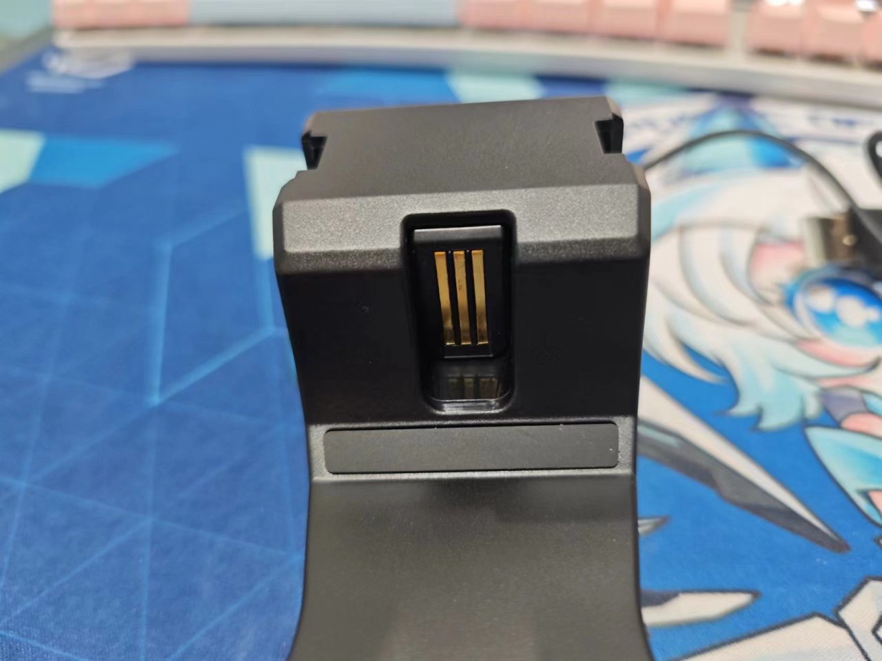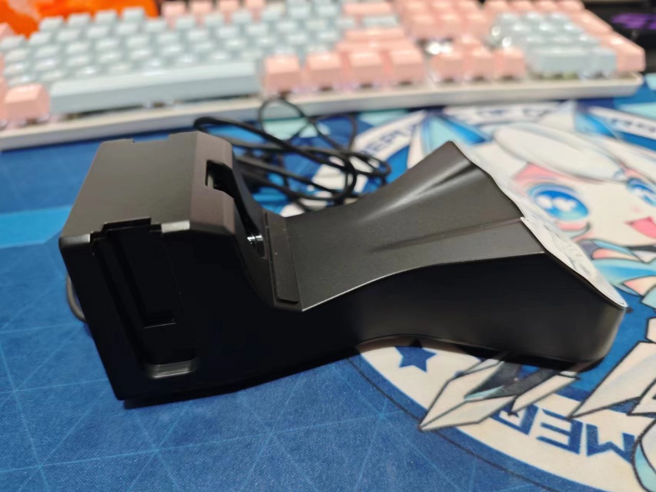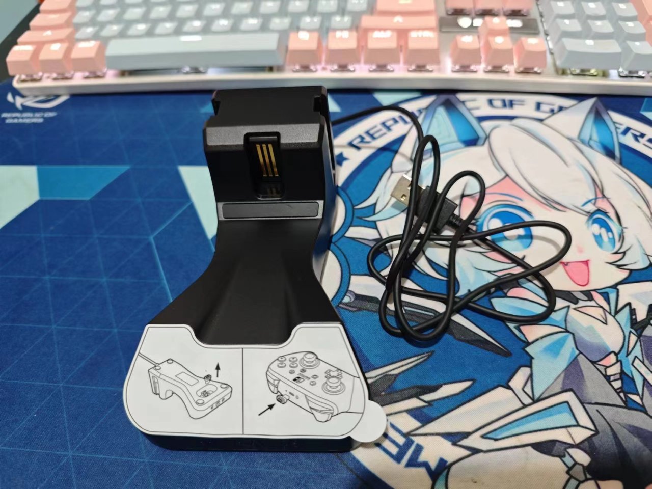 手柄顶部有个type-c插孔,可以有线连接、充电。充电站有个磁吸式充电头,可以插上手柄顶部type-c插孔上充电。