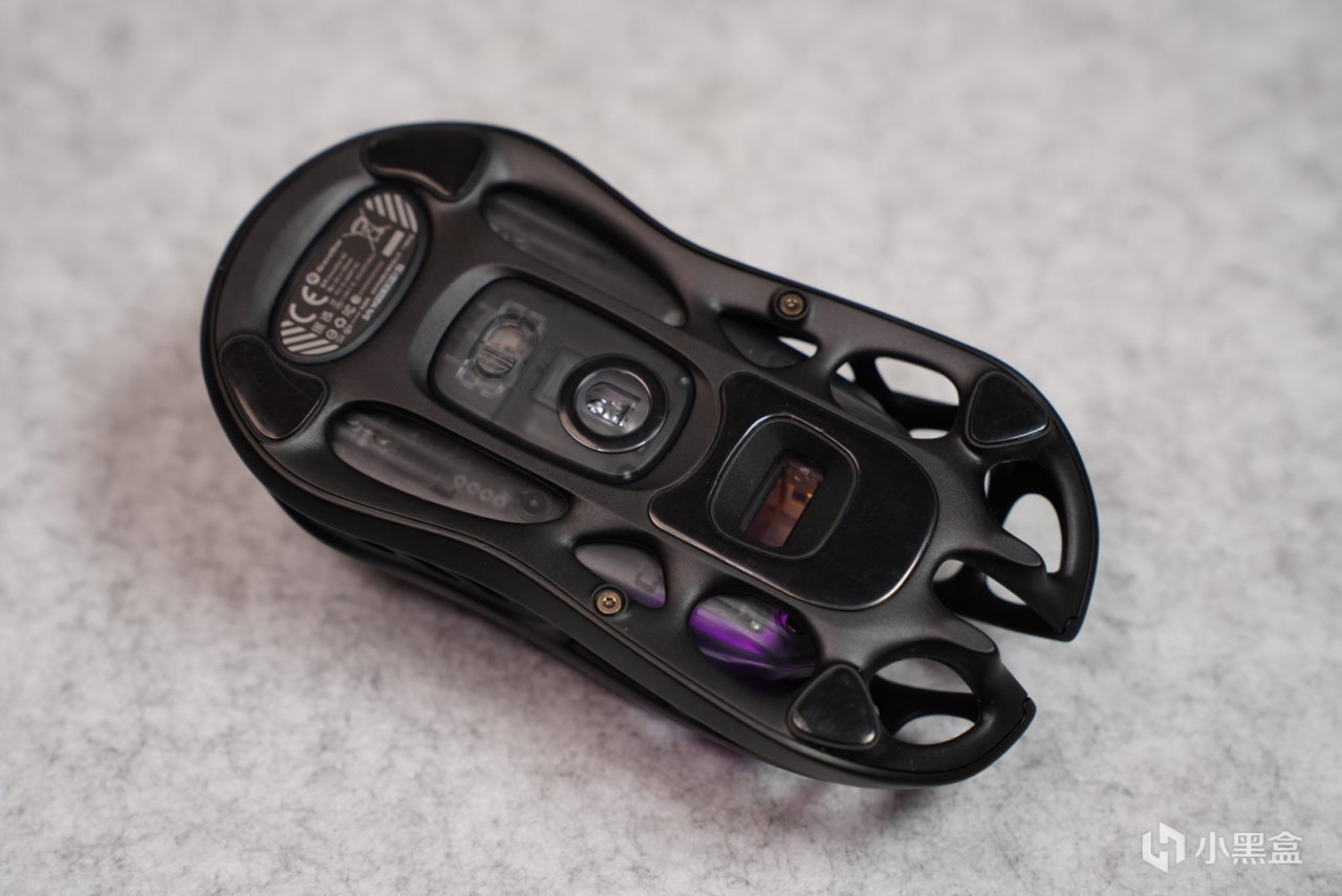 鼠标底部做了镂空的设计,就简单的,开关,传感器,2.4g收纳仓