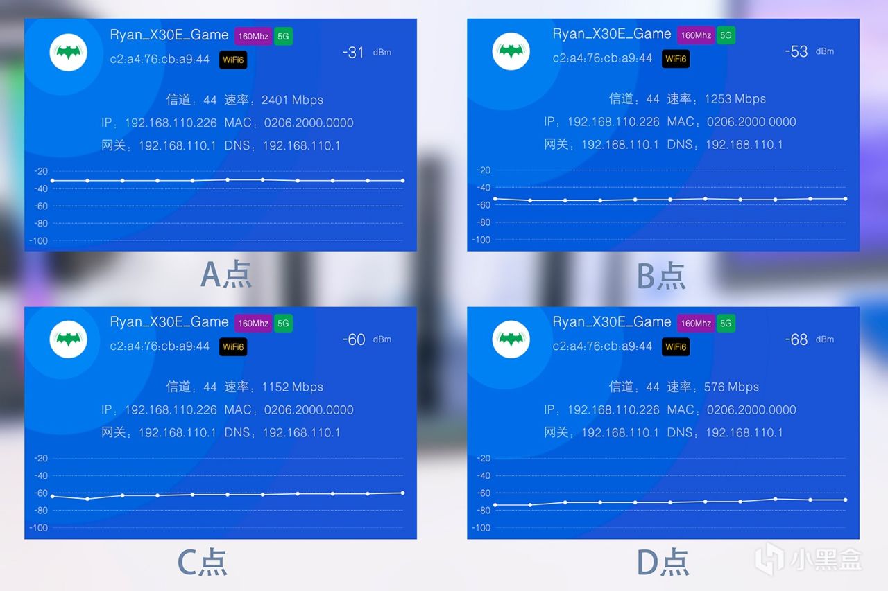 无线信号强度数值大于80dbm,那基本不具备稳定连接的基础,较为容易出现传输速度低和丢包等问题,A点与路由器之间无阻隔且距离较近,因此信号强度是最理想的状态,为其它三个点位的信号强度出现不同程度的衰减,虽然如此,但整体信号强度依然十分稳定。