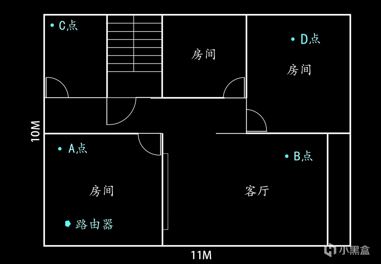 接下来对锐捷星耀黑豹电竞路由器进行实际测试,包括无线传输速度与网络延迟等,首先说一下测试环境,家中的是1000M电信宽带,楼层面积约为110平方米,将路由器放置在房间的办公桌上如下图,并选取同一楼层四个测试点进行测试,台式电脑通过线缆连接至路由器的Game千兆网口,手机是连接Game 5GHz频段。