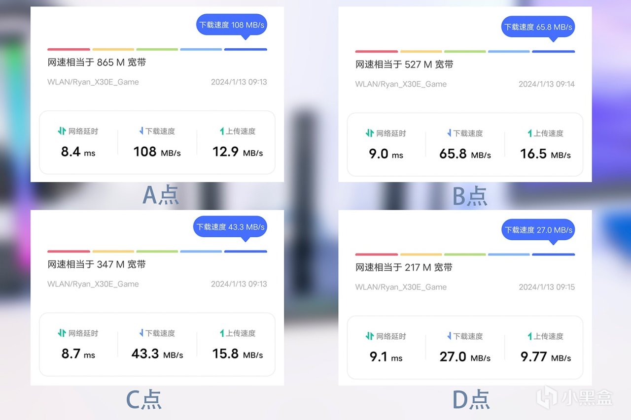 在传输速度方面,A点的传输速度达到108MB/s,这已经达到千兆网口的上限,其它三个点位的传输速度出现不同程度下降,在无线信号最弱的D点传输速度也能达到27MB/s,不过整体的网络延时并不受影响,四个点位的网络延时均在10ms以内。