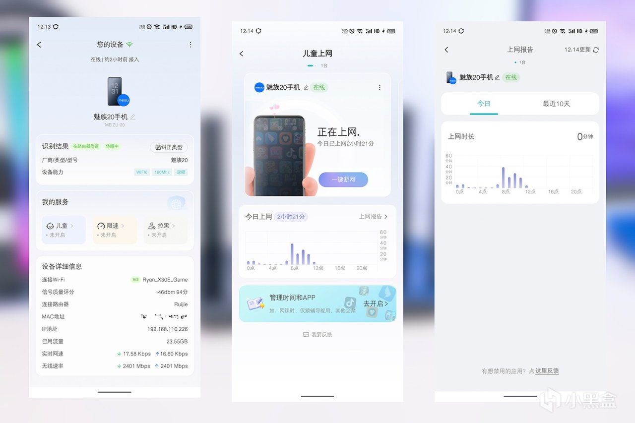在设备板块中查看接入设备连接时间与已用流量等信息,若对设备开启儿童上网功能,甚至能查询设备的上网报告,包括连接网络时间段等内容,另外,还可管理联网时间段以及联网的应用列表,对孩子上网行为适当管理,防沉迷娱乐游戏提高学习效率。