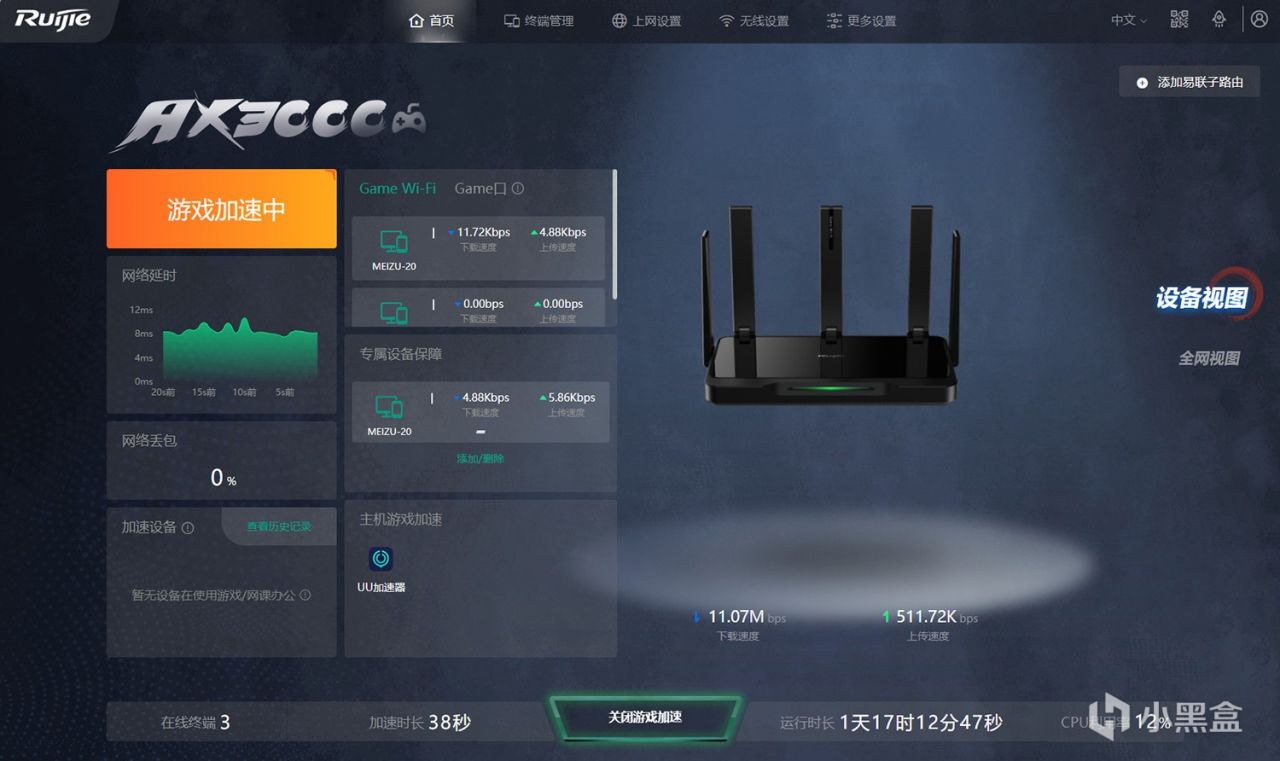 一些更高级复杂的参数设置还是需要在WEB控制端上操作,在主界面上有个游戏加速开关按键,当开启游戏加速后界面会随之出现变化,同时显示当前加速设备与加速应用,路由器会自动识别接入设备的游戏行为,建立独立通道保障网络流畅度。