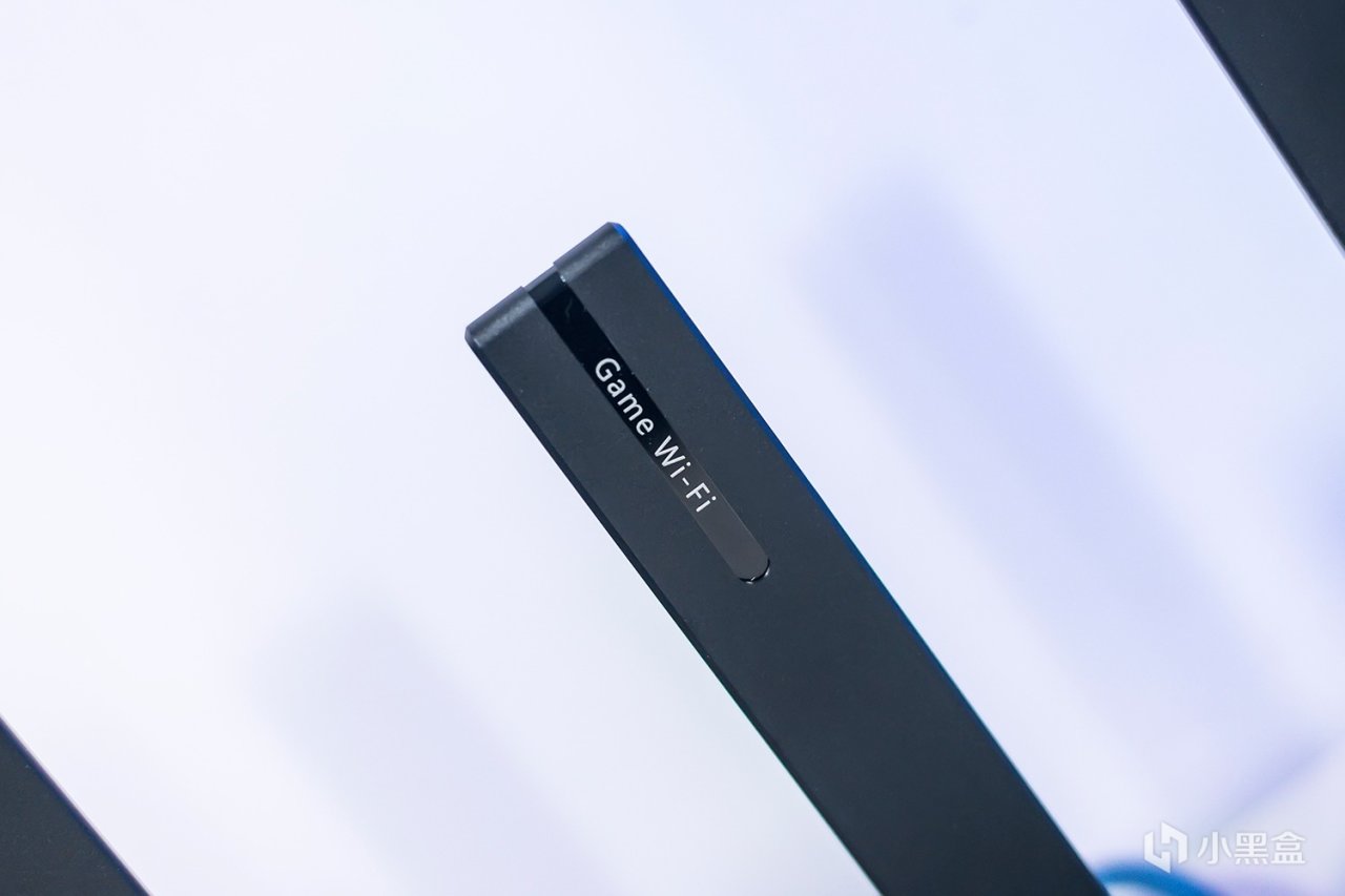 锐捷星耀黑豹电竞路由器共配备了五根外置高增益天线,并且内置了五颗独立高功率放大芯片(FEM),其中三根为5GHz频段三振子天线,两根为2.4G频段双振子天线,其中一根天线上印有Game-WiFi的标识,提供了Game专属无线5GHz频段,全部外置天线均支持折叠收纳起来,可根据实际摆放位置尝试调整天线的角度。