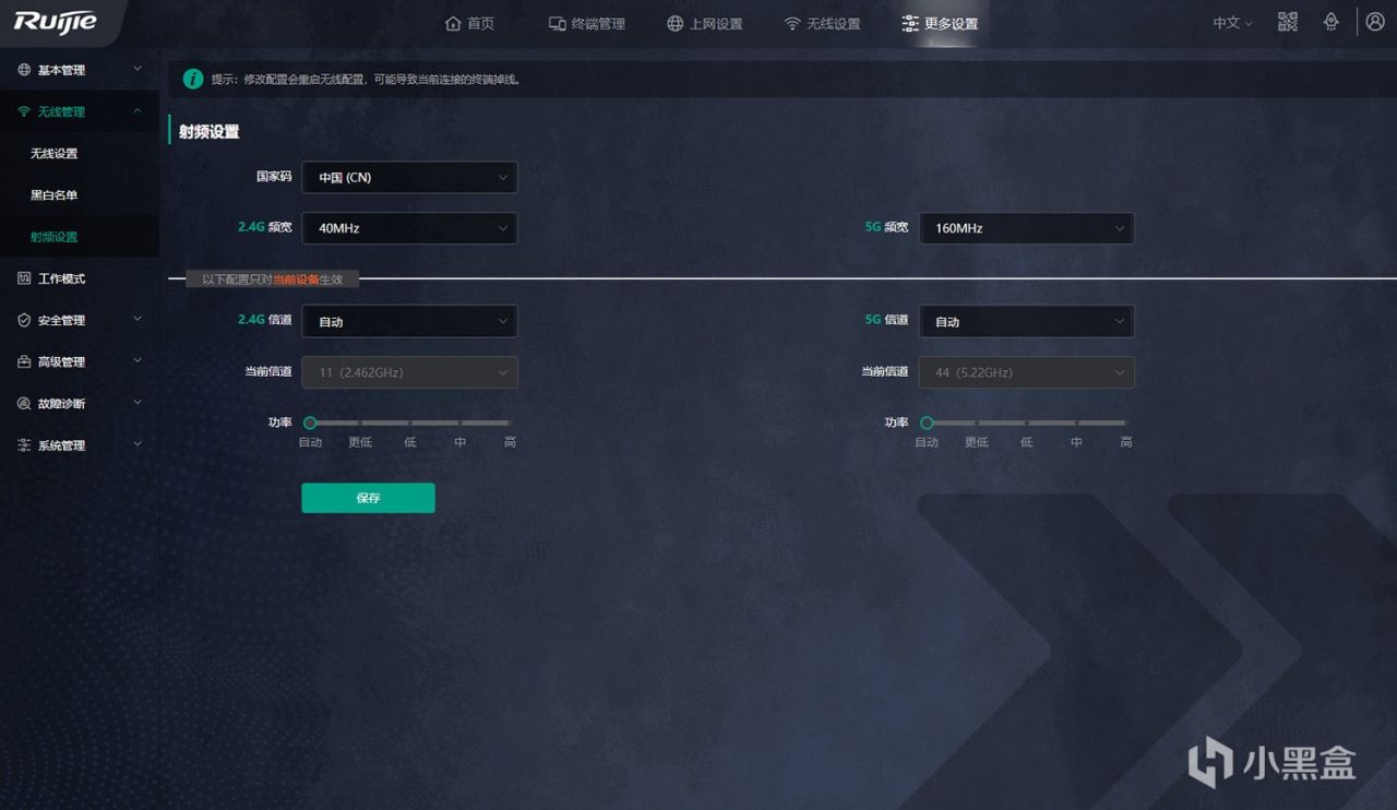在无线网络传输速率方面,锐捷星耀黑豹电竞路由器支持WiFi6(802.11.ax)无线连接技术,其中2.4GHz频段的无线传输速率为600Mbps,5GHz频段支持160MHz频宽,无线传输速率为2400Mbps,双频并发总无线传输速率可达3000Mbps。
