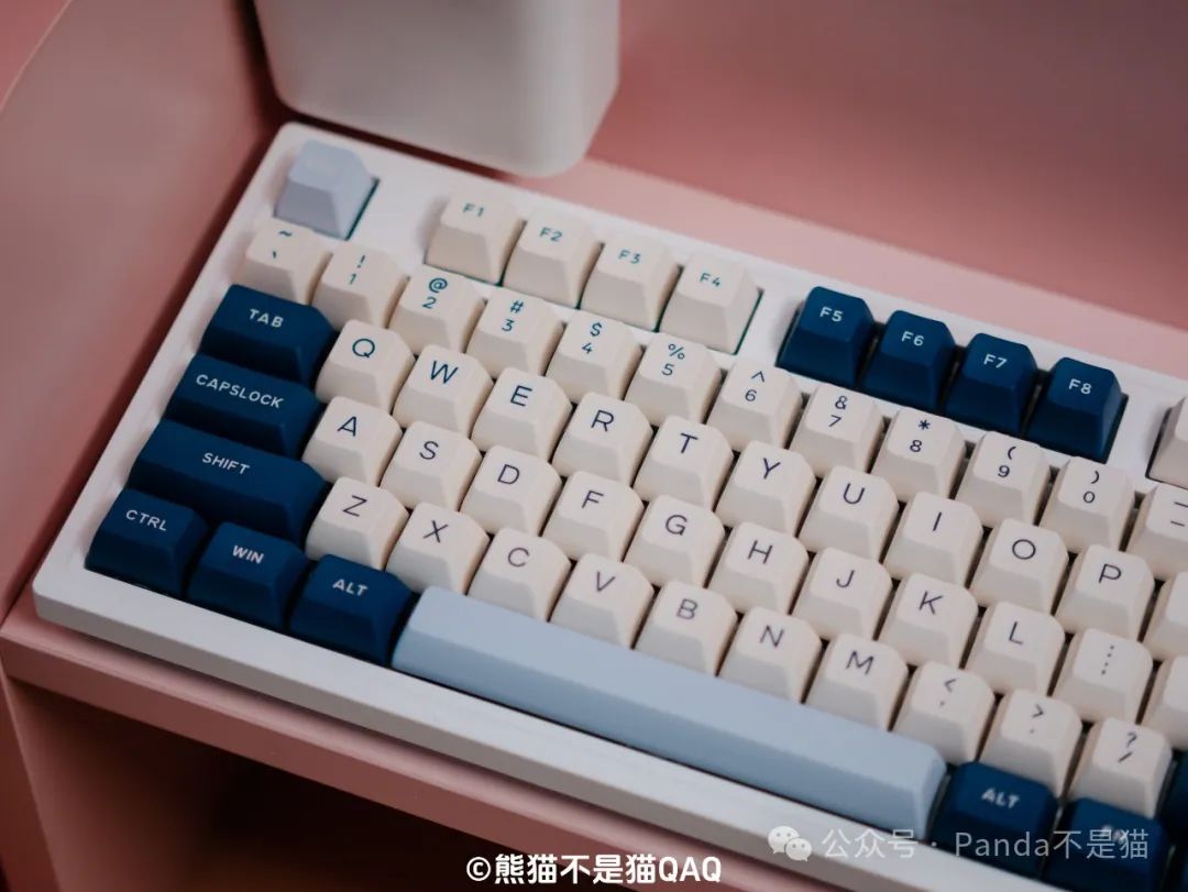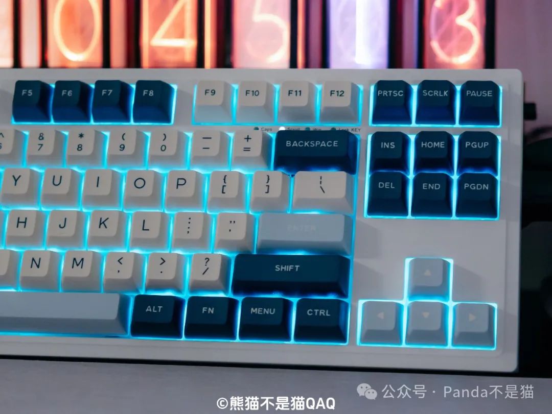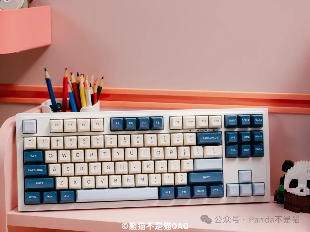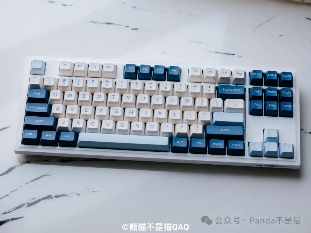 杜伽K100采用了87键位配列,这一设计极大地保留了键盘的多功能性,同时节省了更多桌面空间。87键位的设计也使其成为目前作为笔记本电脑或平板外接键盘使用最为合适的选择。整体键盘呈现出方正的外观,四周底边微微弯曲,搭配出色的配色营造出干净整洁的整体感觉。