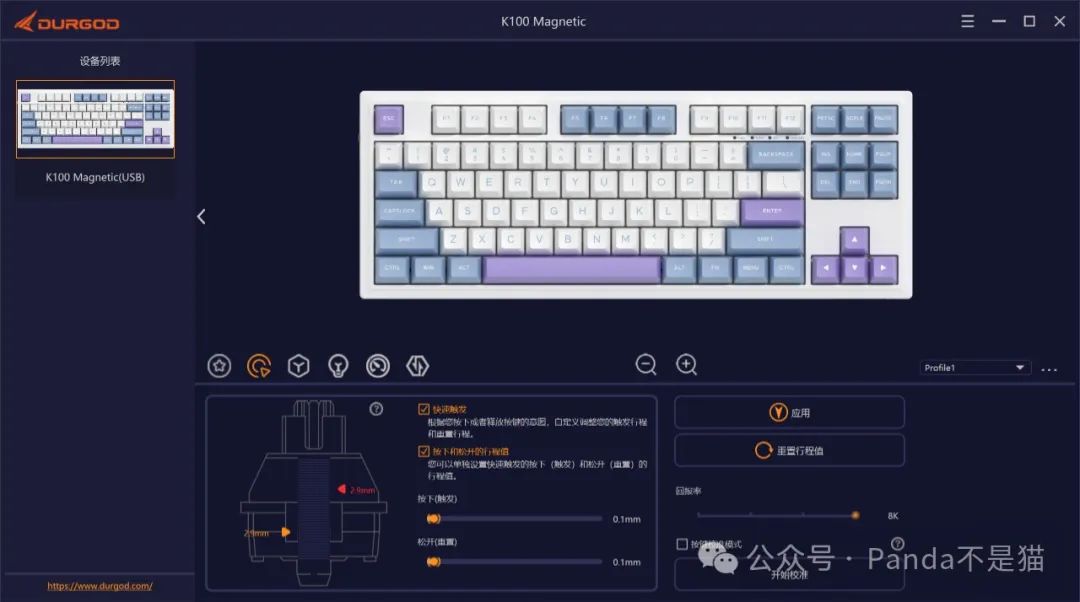 通过杜伽的驱动软件,用户可以轻松地看到键程调节的相关设置。除了常规的0.1mm精度的调节外,还支持分别调节按下和松开时的按键行程,将自定义玩法发挥到了极致。同时,驱动还提供了FN层的高级按键设置以及键盘灯光调节等功能。这也是我第一次使用杜伽的驱动软件,整体界面操作清晰明了,各功能说明也很到位,即便第一次使用也能迅速上手。