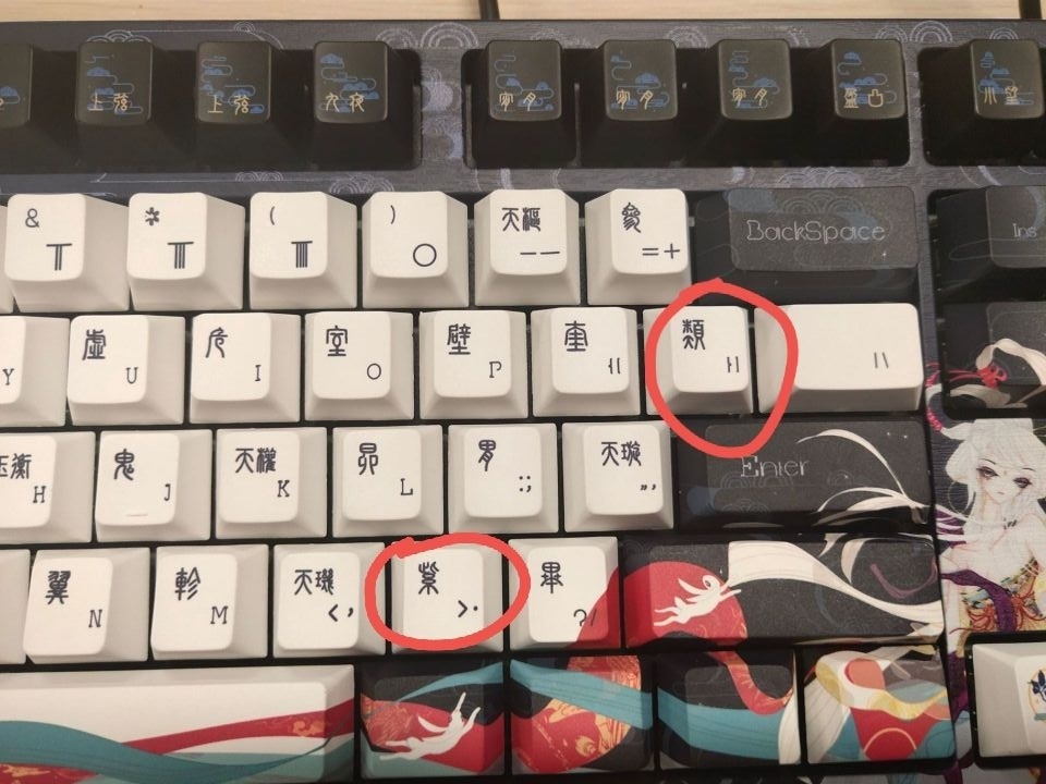 这是个很离谱的错误,我最早是拿到键盘,一眼就看到了这个“类”,太显眼了,最初我还不敢相信这键盘会犯这种抄错字的低级错误,我还以为是这俩字之间有什么演化上的交集,还专门去做了一番考证,考证结果是这俩字从古至今半毛钱关系都没有,然后我就仔细看了一遍键盘,又找到了“紫”。我甚至都能想象到这俩字是怎么打错的——设计师把“娄”认成了“类”,而在打“觜(zī)”的时候,拼音输入法找半天找不到这个字,遂选了个同音形近的“紫”草草了事。我一眼就能看到的低级错误,设计师硬是让它成稿了?