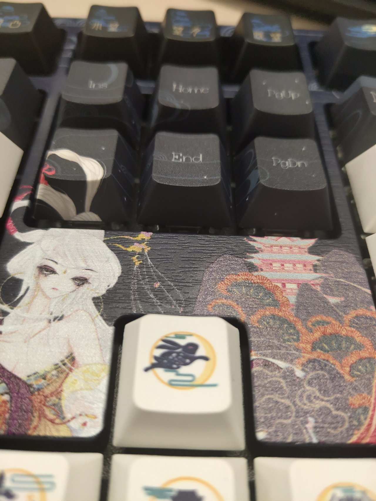 然后看看其他区域,功能区写的是一些月相,大体还是按顺序来的,不过显然设计师凑不出那么多月相,中间还重复了几个。如果开灯的话可以看到键帽上透出来有一排月相,不开灯是完全看不见的,比较有意思。