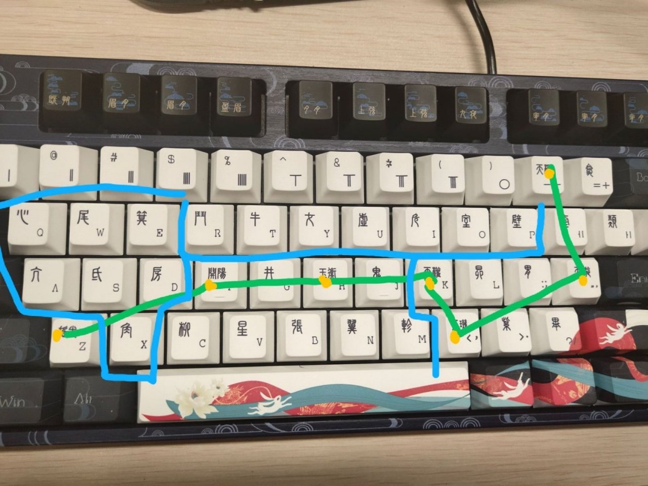 然后在排布上也比较有意思,我简单画了一下,把北斗七星用黄点标注,然后用绿线连接起来,可以看到我们从小就耳熟能详的“勺子”。然后我用蓝线隔开了四个区域,上北下南左西右东分别对应了东西南北四个方位的星宿。不过左右刚好是反的,比如东方苍龙才应该是角亢氐房心尾箕,他画左边去了。不知道是设计师搞反了,还是立意是把键盘倒扣过来看,就刚刚好对得上方位。