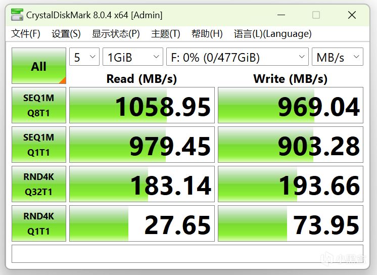CrystalDiskMark测试成绩会比AS SSD高一些,显示顺序读写速度为1058.95MB/s,顺序写入为969.04MB/s,4K随机读取为27.65MB/s,写入为73.95MB/s。