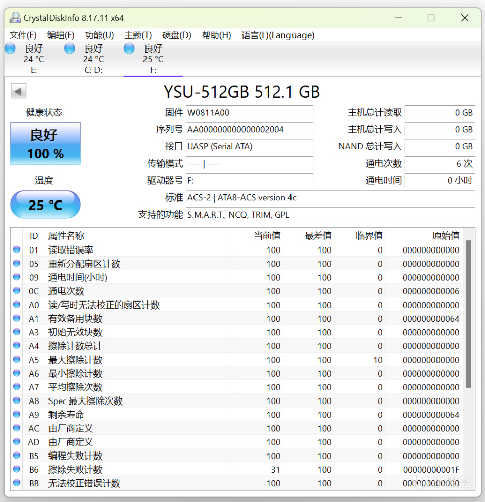 先通过CrystalDisklnfo软件查看接口与标准,移速逸V Pro双口固态U盘的接口为UASP,标准为ACS-2 / ATA8-ACS version 4c,并支持S.M.A.R.T.硬盘状态检测预警、NCQ原生命令队列、TRIM等功能。