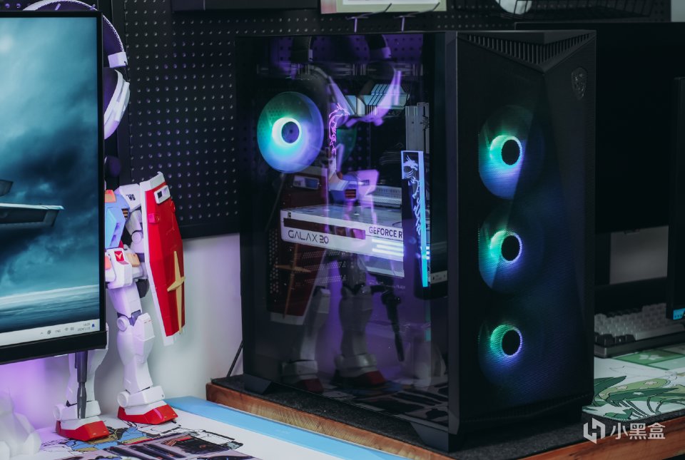 机箱方面选用的是微星氪金枪3,该机箱定位为中塔机箱,机箱出厂就是满配状态(4个ARGB风扇+ARGB显卡支架),内部还带有ARGB HUB,方便用户接入更多的ARGB设备,喜欢光污染的小伙伴非常推荐。