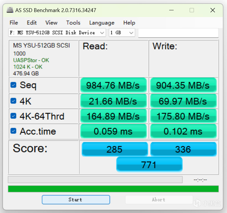 AS SSD实测,顺序读写速度为984.76MB/s,顺序写入为904.35MB/s,4K随机读取为21.66MB/s,写入为69.97MB/s,得分达到了771分,可能是因为速度翻倍的原因,其得分要比一般的SATA固态高一些。