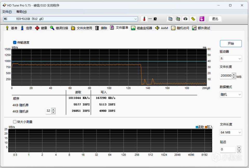 为了测试移速逸V Pro双口固态U盘的缓存以及会不会掉速,通过HD-TUNE进行了200GB的文件基准测试,显示写入到130GB的时候会出现掉速,速度会下降到100MB/s左右;好在读取速度非常平稳,几乎是一条直线,保持在1011MB/s。