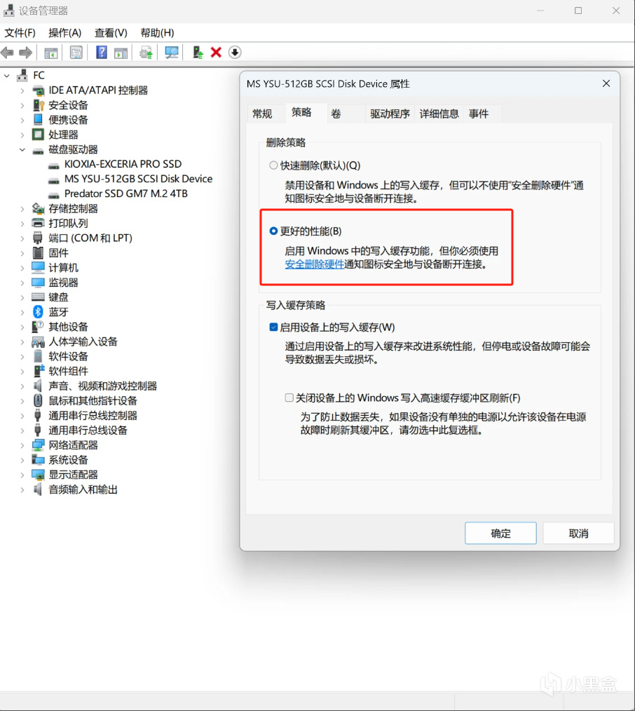 同时,为了获得更好的性能体验,需要在硬件设备管理器中将策略选择为更好的性能。