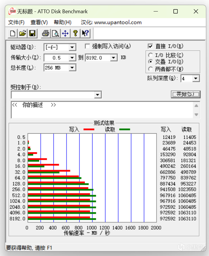 ATTO测试,平均写入速度达到了972MB/s,读取速度达到了1063MB/s。