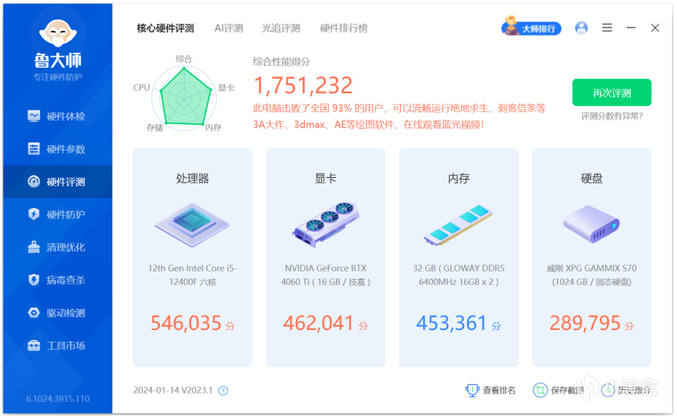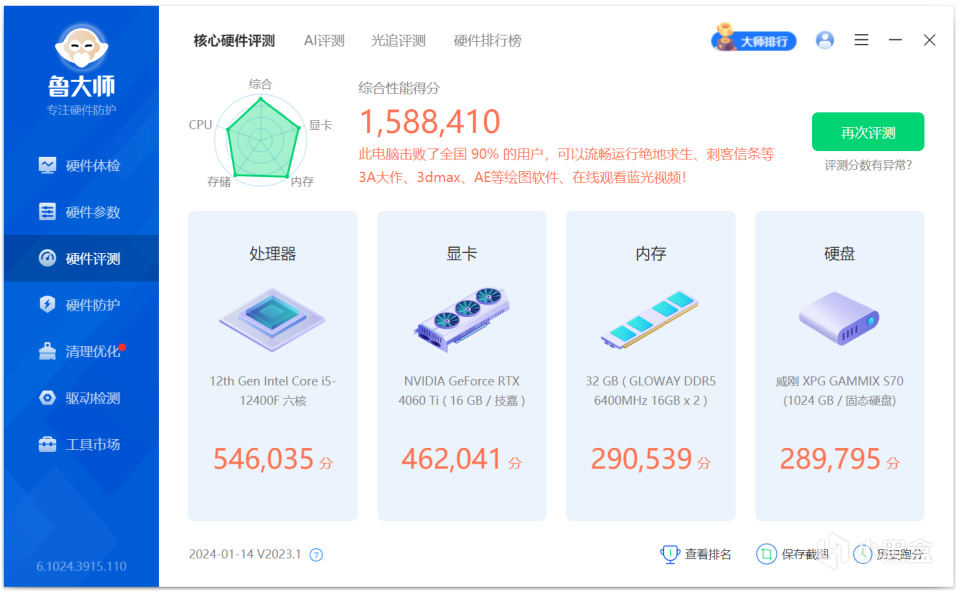 在默认的设置(内存未开启XMP),整机的评分为158.8万,看起来并不算高。