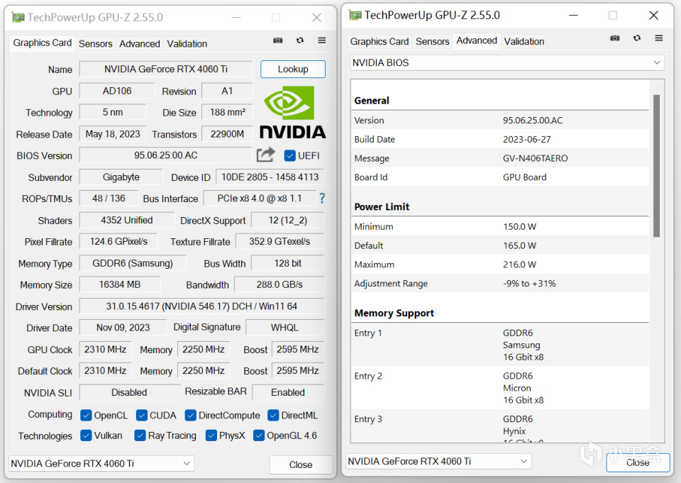 具体规格方面,技嘉RTX 4060 Ti AERO OC 16GB搭载的是AD106-350-A1核心,具备拥有4352个CUDA核心,配备34个第三代RT core核心和136个第四代Tensor core。频率方面要比公版高一些,其中核心基础频率为2310MHz,Boost频率2580MHz。最关键的是我这次入手是16GB显存版本,得益于大显存,在一些AI功能上会带来更快的处理速度。