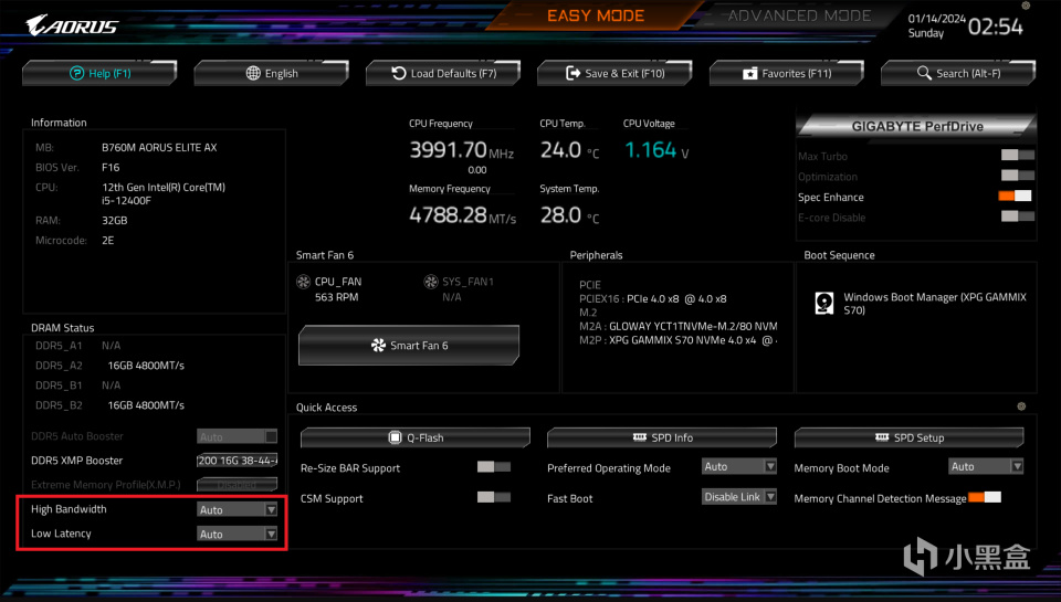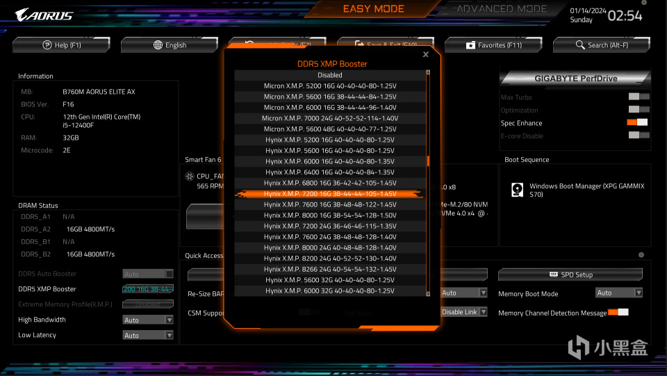 这一方面是内存的XMP设置,另一部分不得不说说技嘉主板的黑科技。将技嘉B760M AORUS ELITE AX主板的BIOS升级到最新的F16版本后,直接开启DDR5 XMP Booster功能,将内存频率升级到7200MHz,并且电压、时序都是设置好的,无需额外操作。