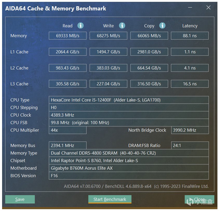 比如在默认的情况下,内存的读取速度为69333MB/s,写入速度为68275MB/s,复制速度为66065MB/s,延迟为88.1ns。