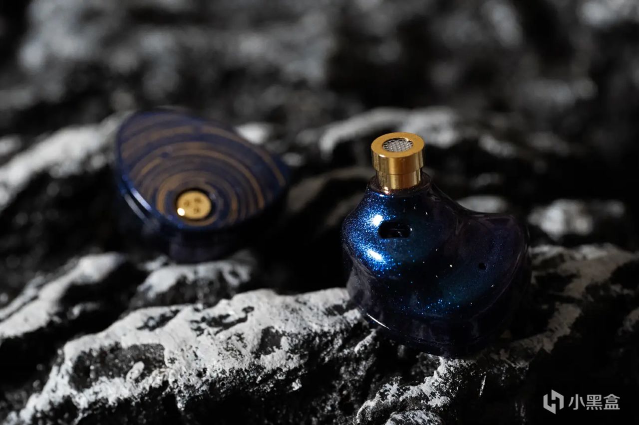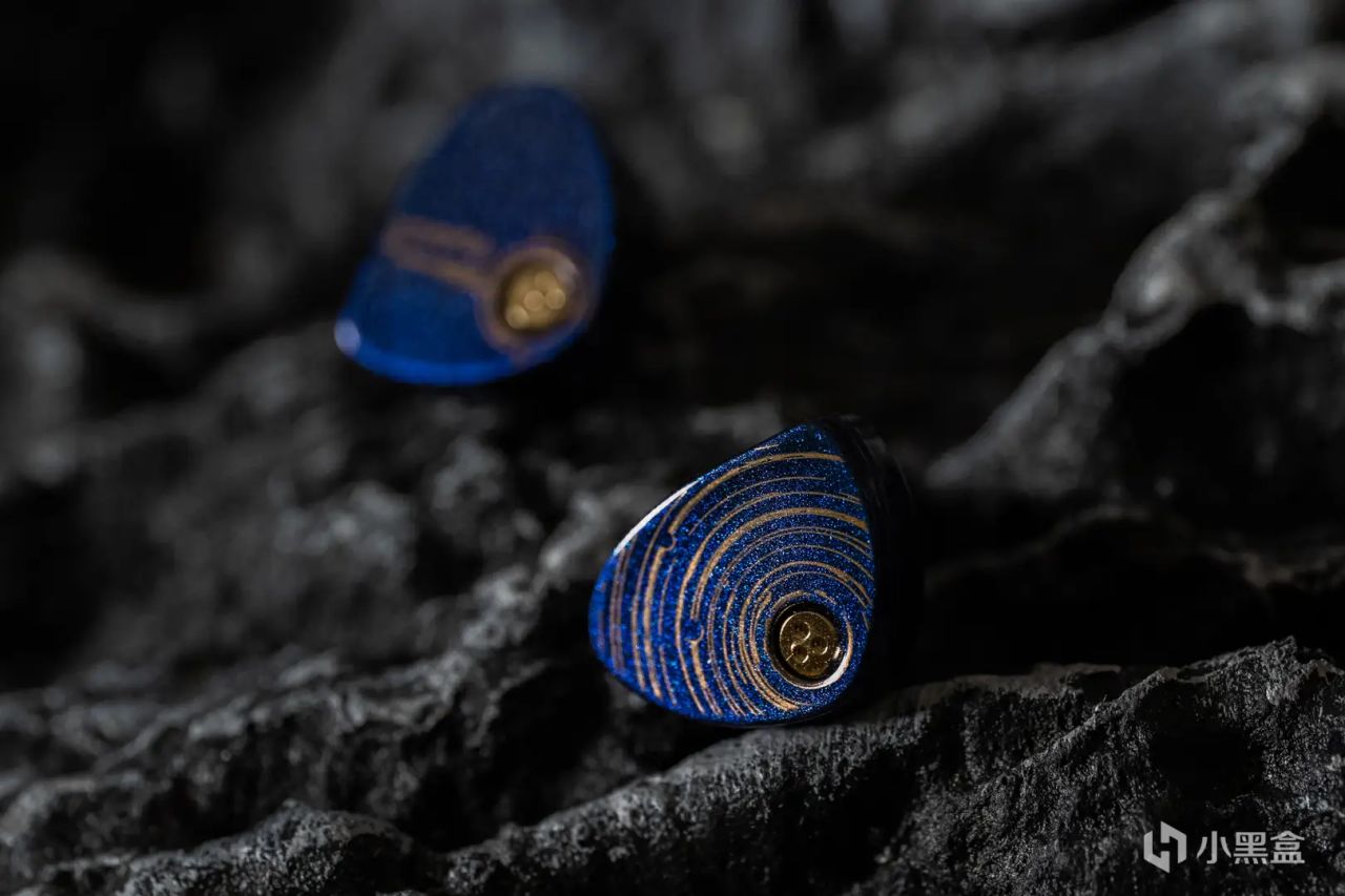 耳机本体延续了它的浓墨重彩,合金熔铸成型的精雕壳体,表面经过变色烤漆处理。同样是深邃的蓝色,比线材上的蓝稍微淡一些,上面布满星星点点。两个面板的点缀略有不同,其中一面有点像是用慢门拍摄的星轨,叫做星野,很应景昂!