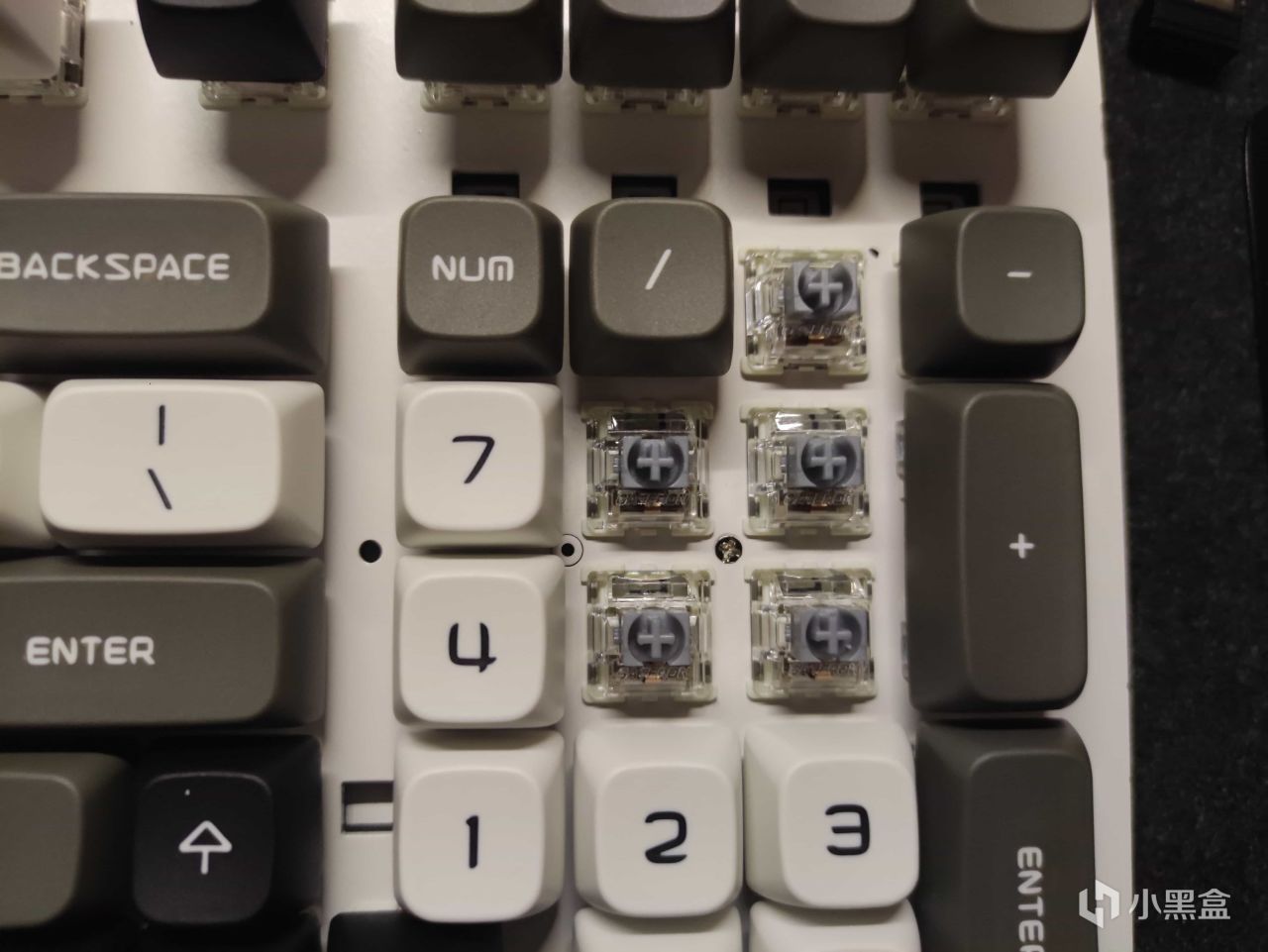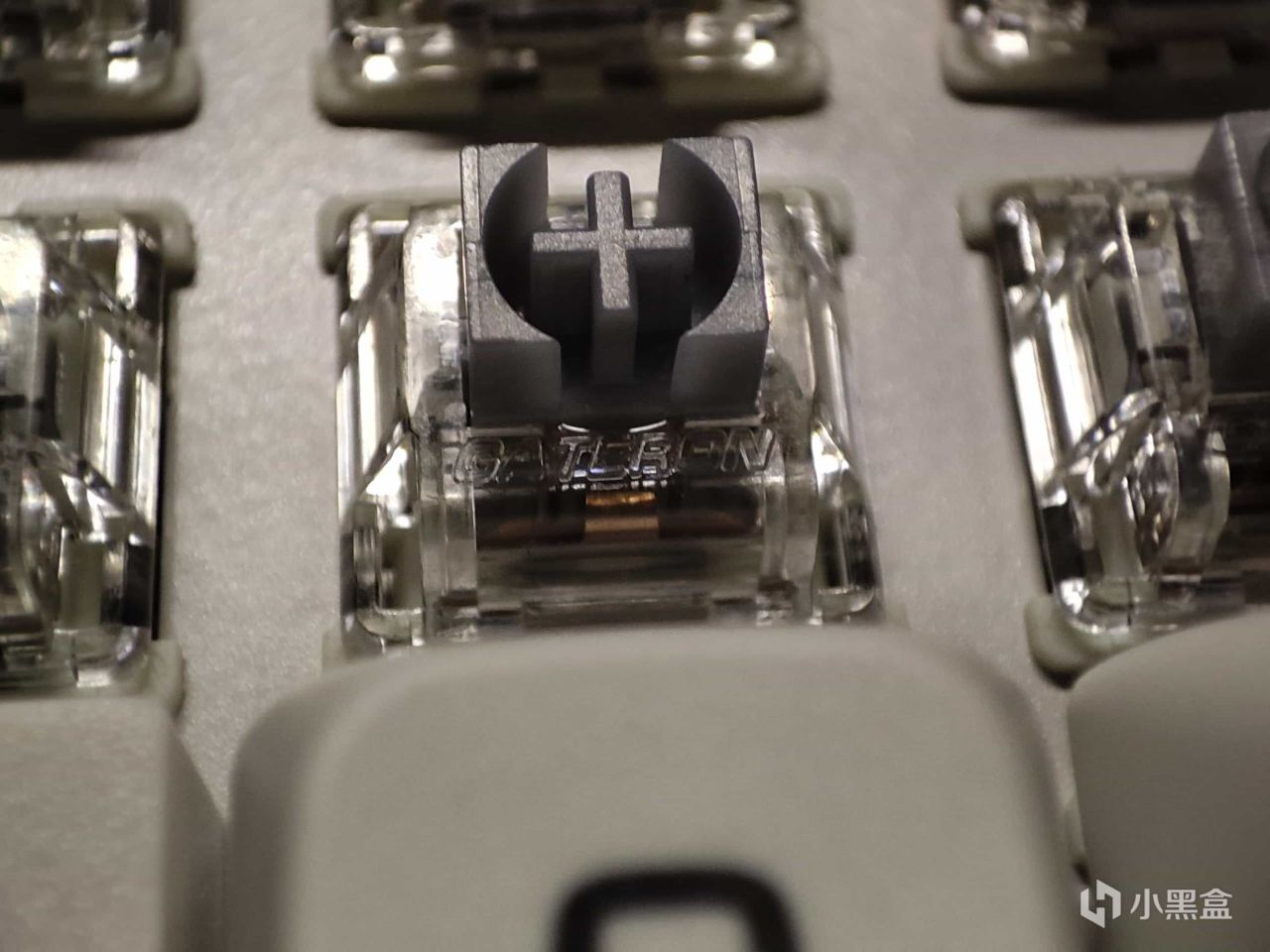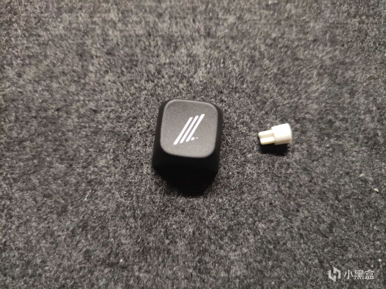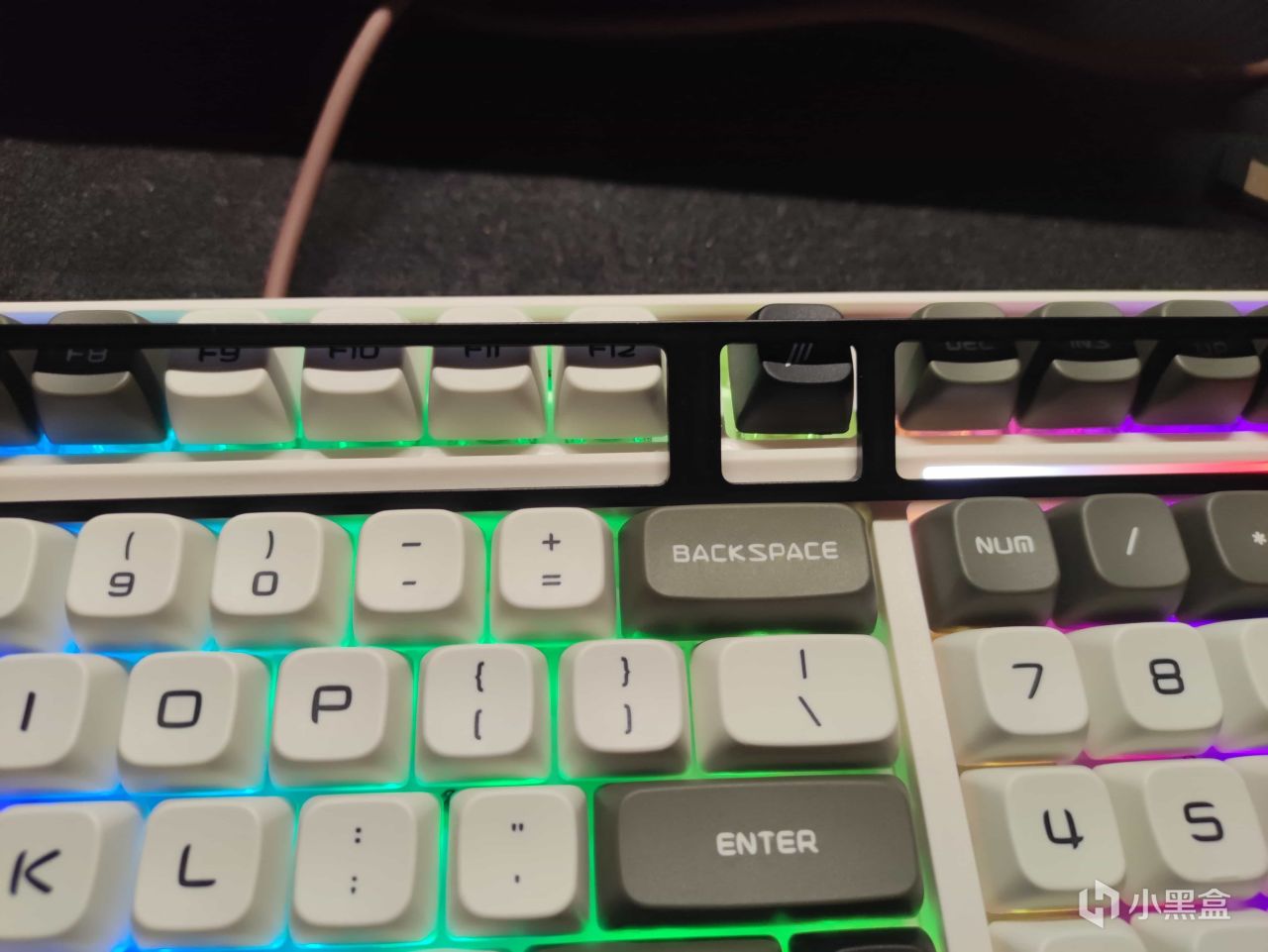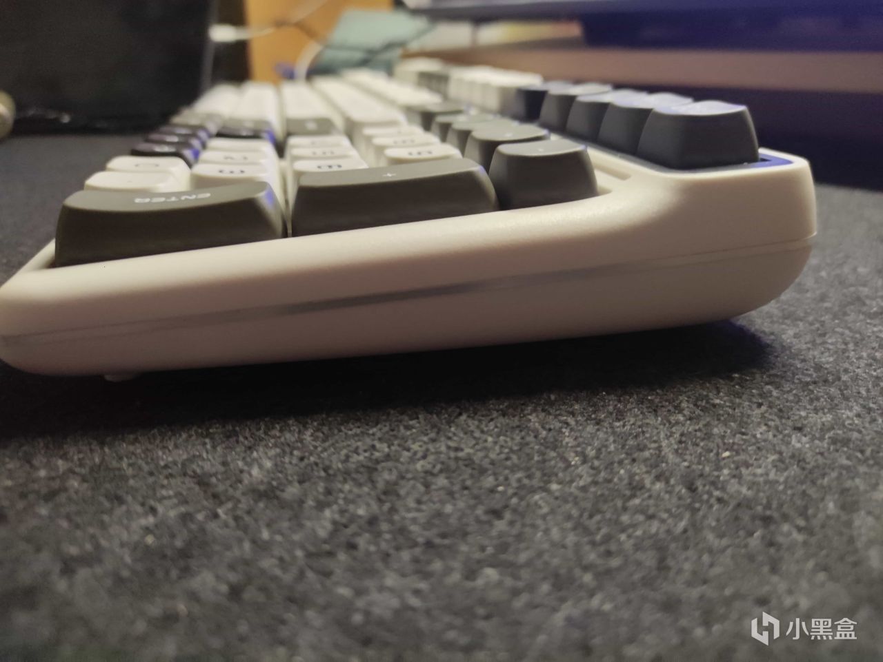 键盘的正面需要再说一下的是键盘的上方的功能区的按键再键帽下增加了一个延长器,使其高度增高,但是也带来了相对于字母区轴心晃动增加的问题。