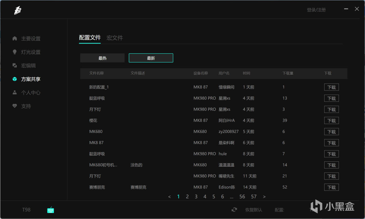 在上手这款键盘的驱动时看到了一个十分有趣的东西,就是一个叫做方案共享的分区,里面放置的是其他玩家自己设计的键盘RGB灯光方案,十分的好用。