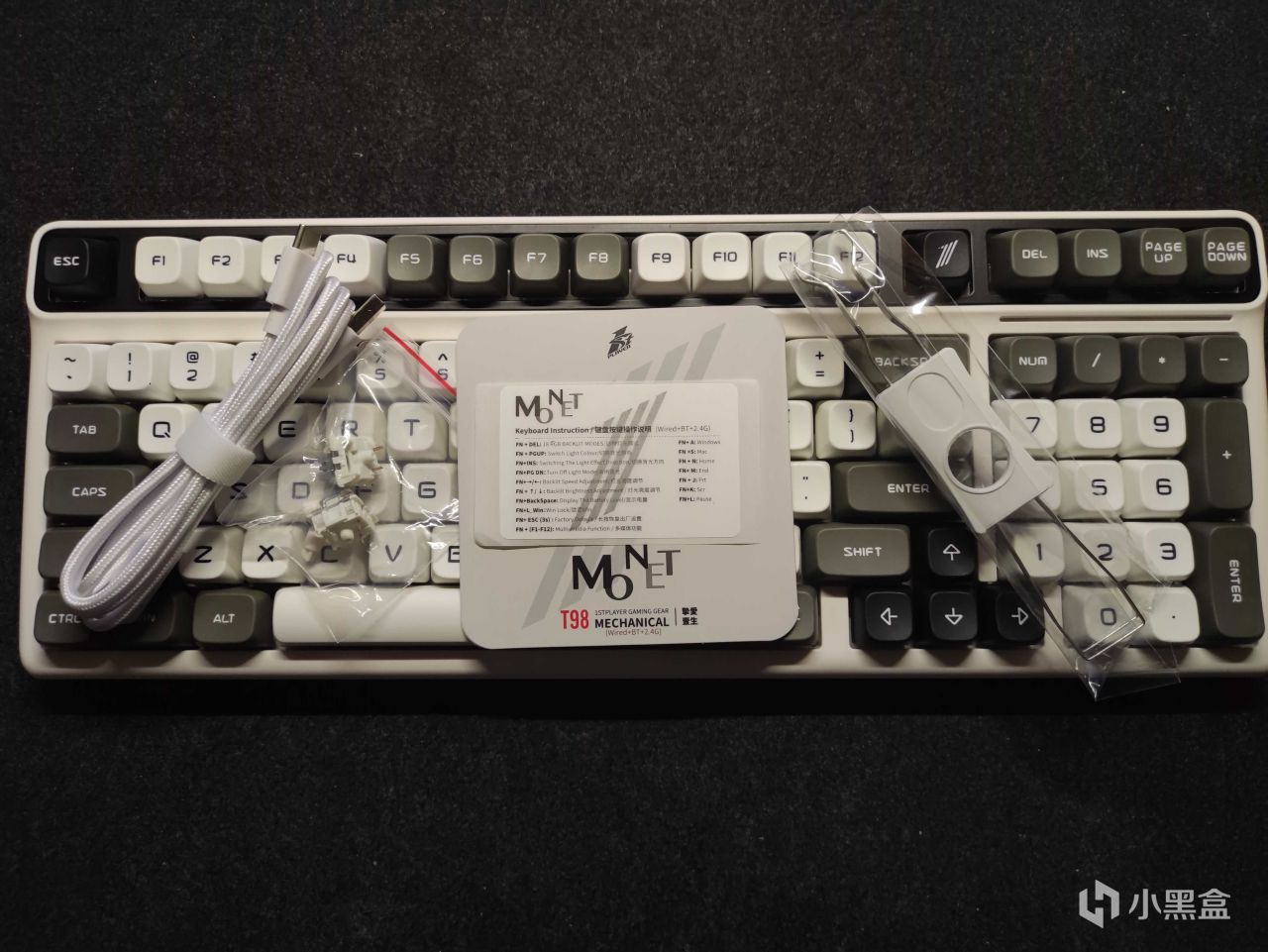全家福:键盘、一个功能按键贴纸、说明书、两用拔轴器、两颗增补轴体、数据线。(问了客服购买会送这款键盘同款配色的增补键帽)