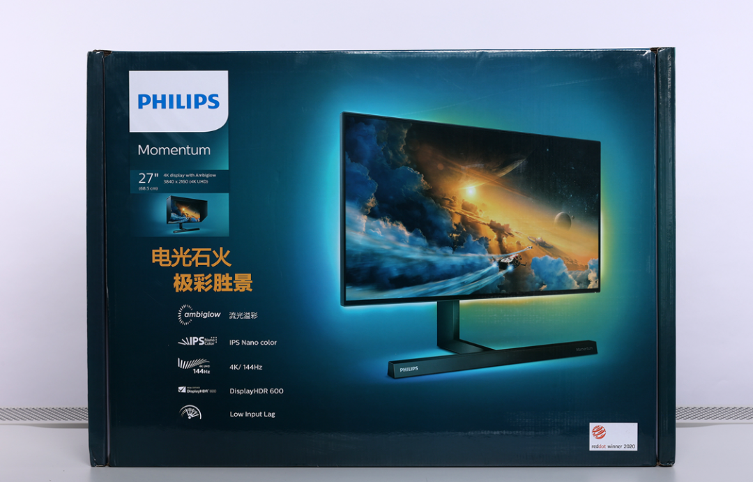 外箱无损,必须给物流先点个赞。显示器外包装整体采用了暗蓝色配色,包装正面印有显示器本体渲染图以及NanoIPS、流光溢彩、4K144Hz、HDR 600、低延迟输入等特色功能的标识。包装右下角还有红点设计奖的认证标识;