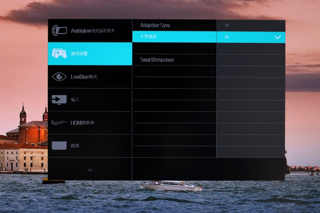 此外,显示器还针对不同的游戏场景,提供了多种预设。在Adaptive-sync自适应垂直同步技术和Smartresponse拖影消除技术的加持下,显示器在面对水花、烟雾等场景时,可以有效避免拖影对玩家视觉观感的影响。同时,对于FPS玩家,飞利浦还特别提供了辅助瞄准的十字准星功能,让玩家在进行盲狙时,可以更加准确;
