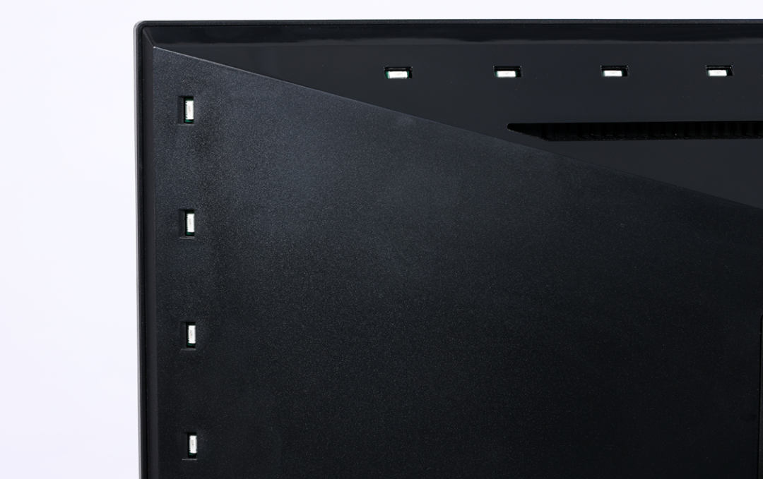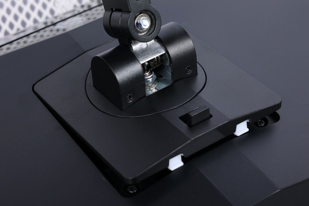 显示器背部线条设计棱角分明,背部中心为显示器的Vesa支架接口,支架最大支持安装100 x 100mm规格的Vesa壁挂支架。四边则是一圈流光溢彩LED灯珠,其中上下边各有10颗,左右两边则有6颗。裸露的灯珠设计,让整个背面相对粗犷;