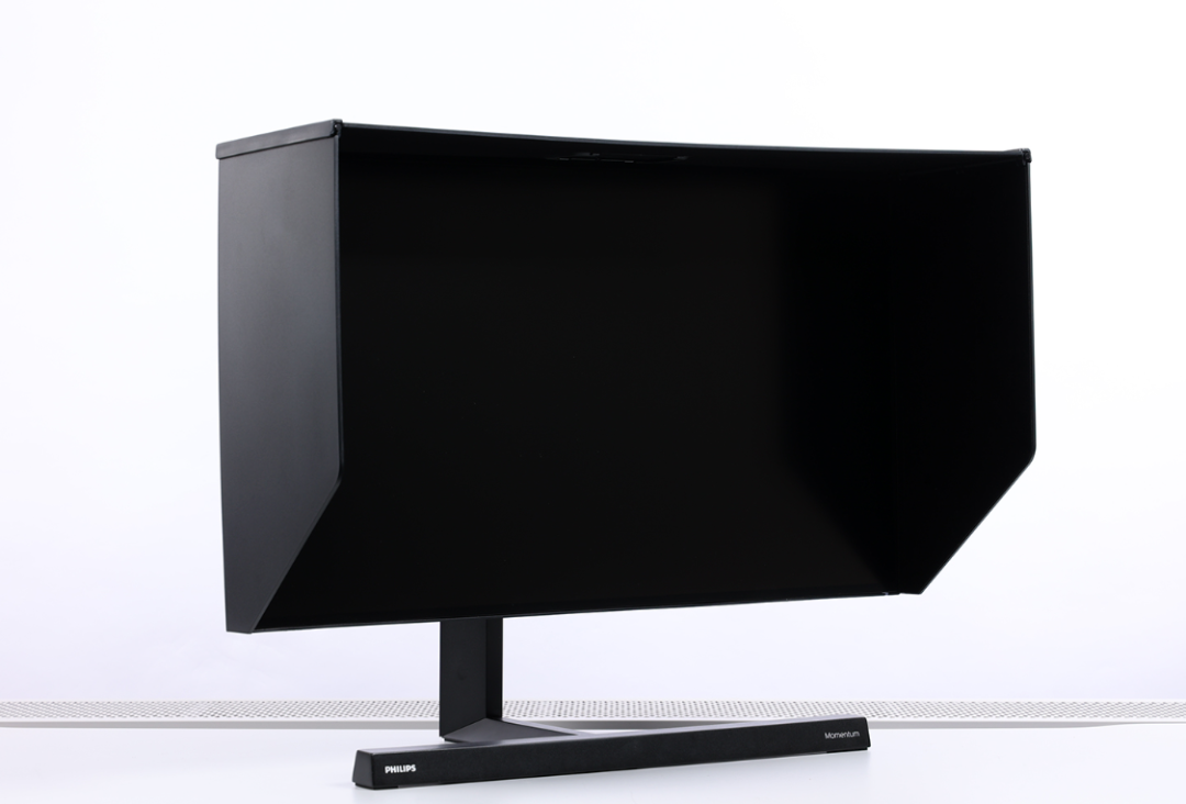 显示器还配备了一块可拆卸遮光罩。遮光罩内部覆盖了一层高密度植绒吸光布,可以有效吸收来自屏幕外侧的杂光,保证玩家可以正确的看到显示器显示的画面色彩。
