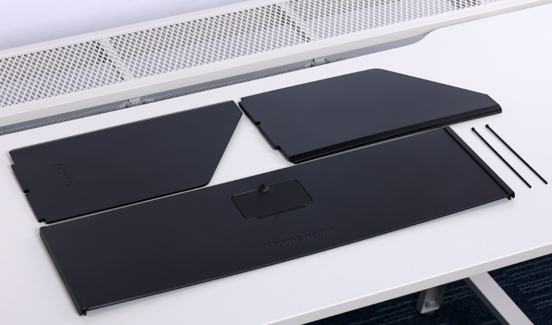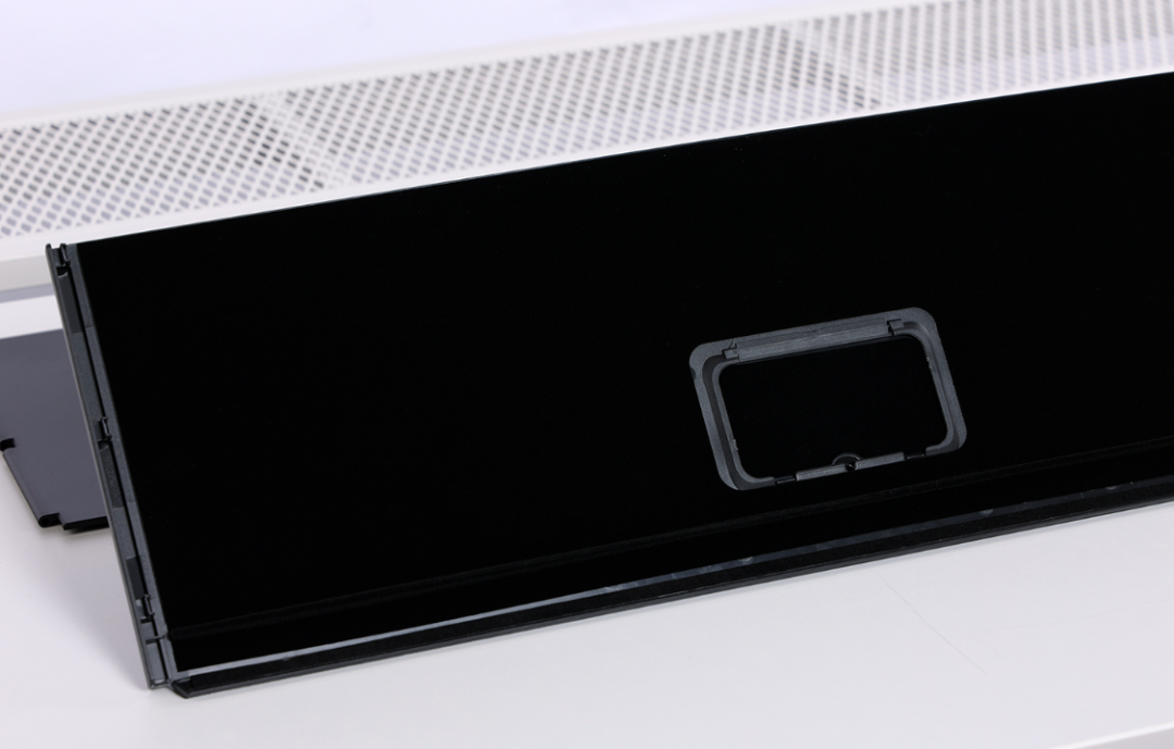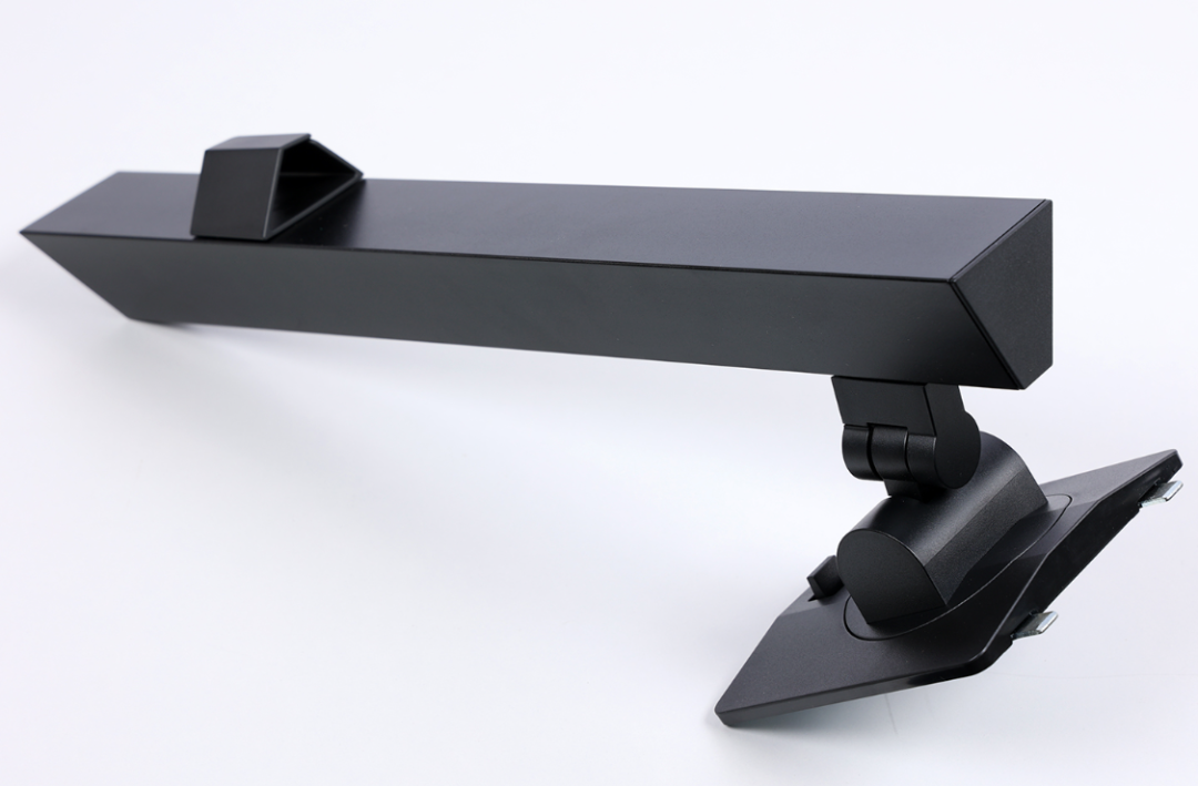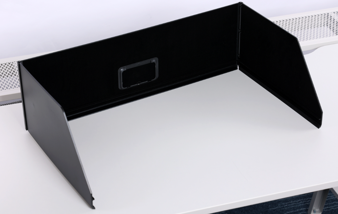 整个遮光罩分为三块遮光板,其中,在顶部遮光板的中部还设计了一块用于安装校色仪的掀盖式开窗。两侧的遮光板则通过配件盒中配备的金属插销杆与遮光板上的卡榫连接固定在一起;