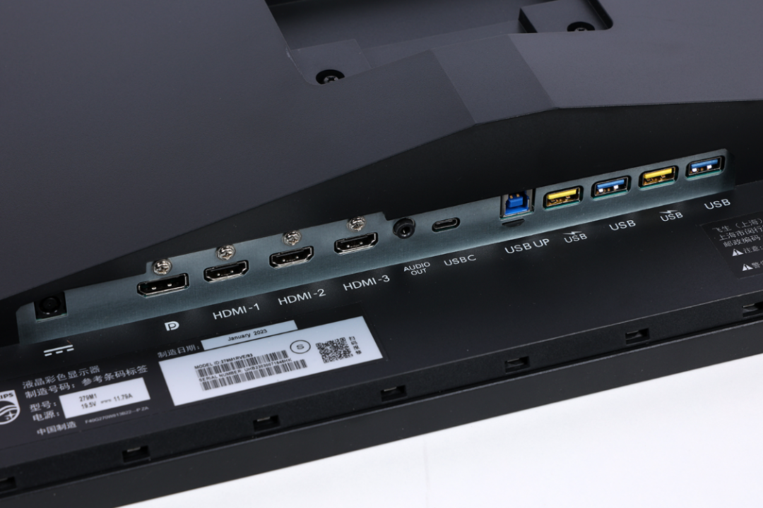 接口方面:外置DC电源接口 *1、Type-C接口 *1,DP 1.4 *1,HDMI 2.1 *3,3.5mm耳机音频孔 *1,USB-B *1,USB-A *4。其中,DP视频接口支持DSC视频信号压缩技术,可以实现单线传输4K 144Hz 10bit视频信号的功能,3个HDMI 2.1接口则最高支持传输4K 144Hz 12bit的视频信号。Type-C接口除了支持PD 65W的反向快充功能以外,也支持DP Alt视频传输功能,可以实现单线传输4K 144Hz 8bit的视频信号。4个USB-A接口提供了2种不同颜色的接口,黄色的接口支持关屏后充电的功能,蓝色的则不支持;