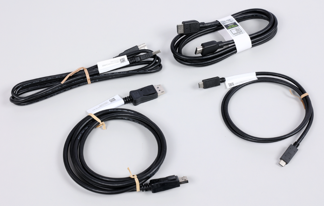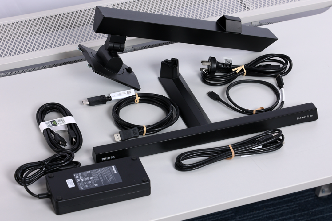 配件明细:1个支撑杆、1个底座、1根 DP 1.4视频线、1根HDMI视频线、1根Type-C to Type-C多功能线、1根USB-A 转 USB-B数据线以及一组电源适配器;