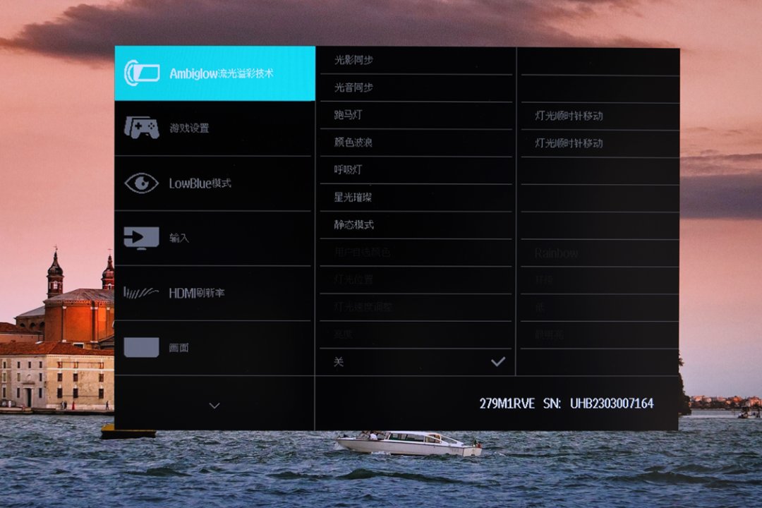 低调又有质感的显示器成品,通电之后,显示器背部的32颗高亮LED灯珠,可以营造出非常不错的电竞氛围。在显示器的OSD菜单页中,还可以开启光音同步或光影同步功能,让显示的背部灯光可以跟随显示器内的声音或画面进行同步调节;