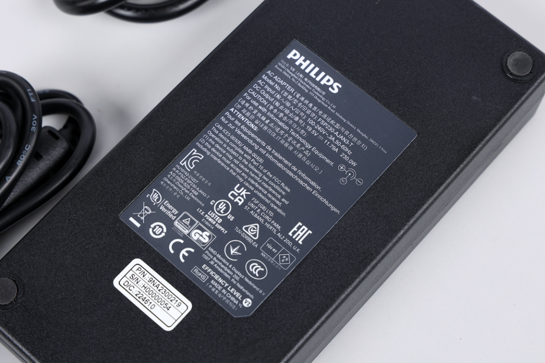 方形电源适配器,最大可提供230W的功耗输出,四角有防滑软胶垫
