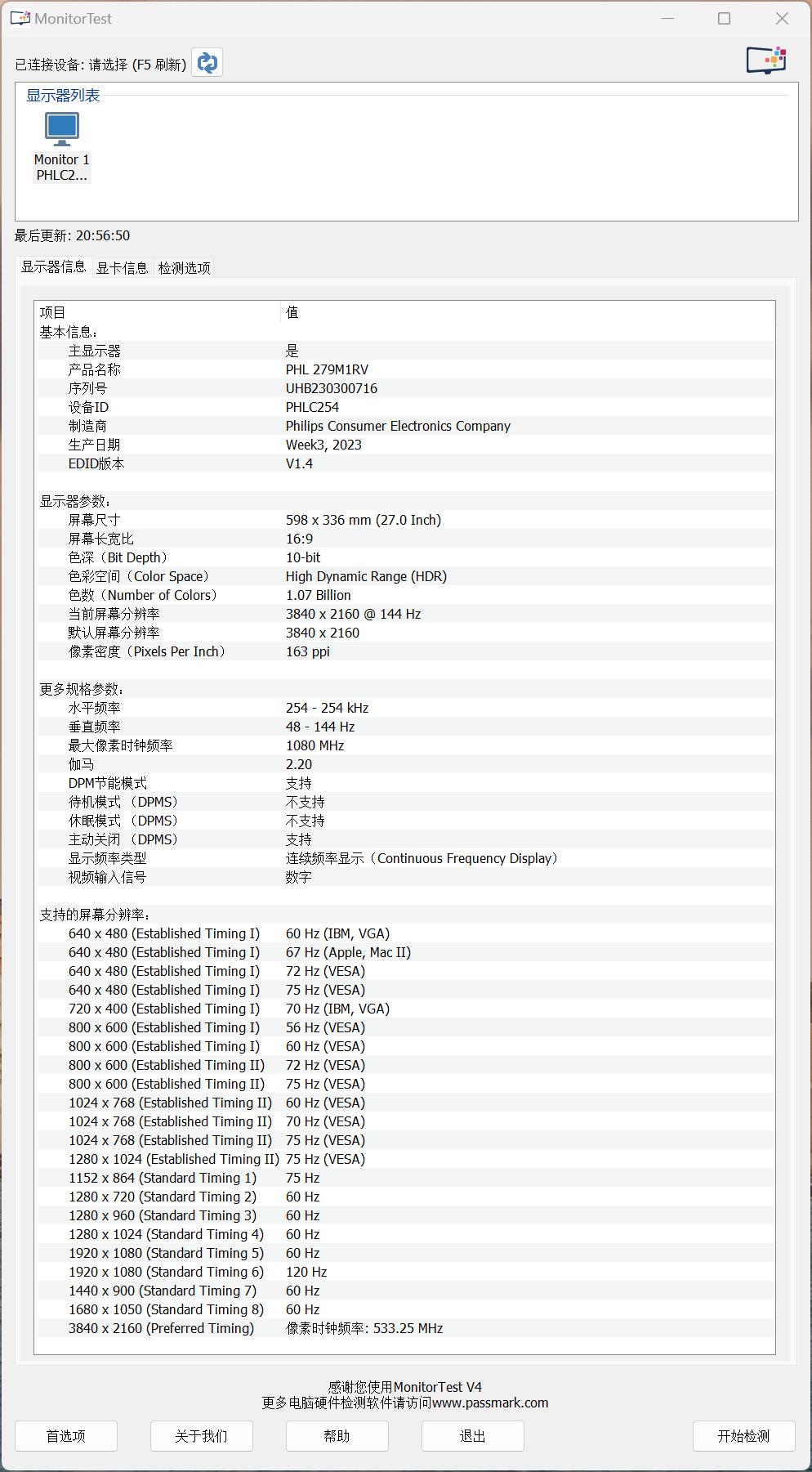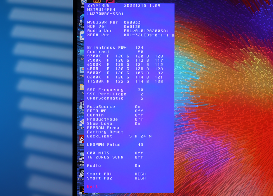进入显示器工程模式后,可以看到显示器采用的是满血LG R8显示器屏幕,屏幕型号为LM270WR8-SSA1。整体表现上,这块LG R8的屏幕素质与友达7.0相差不大,支持原厂HDR 600动态范围显示;