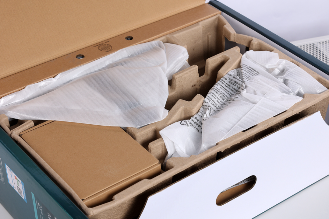 对于显示器来讲,掀盖式包装比常见的抽拉式包装操作更方便。瓦楞纸纸托材料,环保又实用。