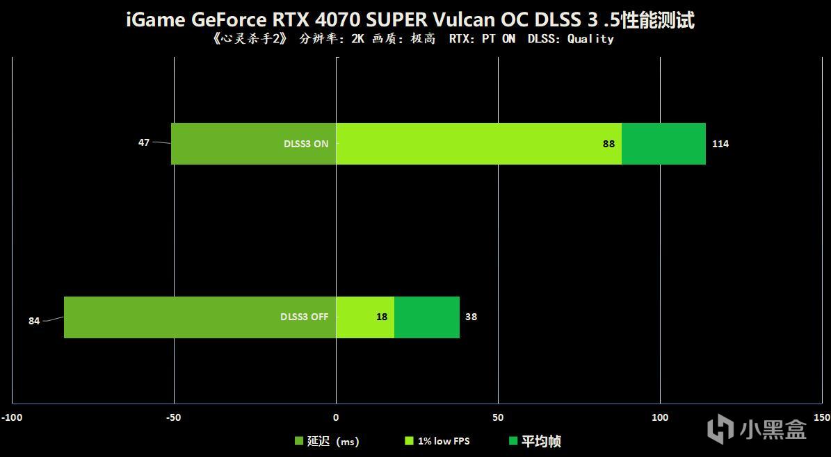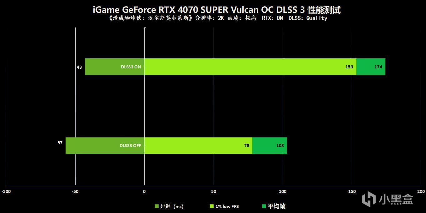 《蜘蛛侠:迈尔斯莫拉莱斯》是一款开放时间的游戏,玩家将扮演蜘蛛侠游荡在纽约市的布鲁克林区,在如此激烈惊险的动作体验里,DLSS 3可以为我们提供更为丝滑流畅的战斗体验,在DLSS 3技术的加持下,游戏的1440P帧数从103帧提升到174帧,代表着游戏流畅度的1%LOW帧数也近乎翻了一倍,同时得益于Reflex技术,游戏延迟的情况也得到了改善,DLSS 3是全方位的提升了游戏体验。