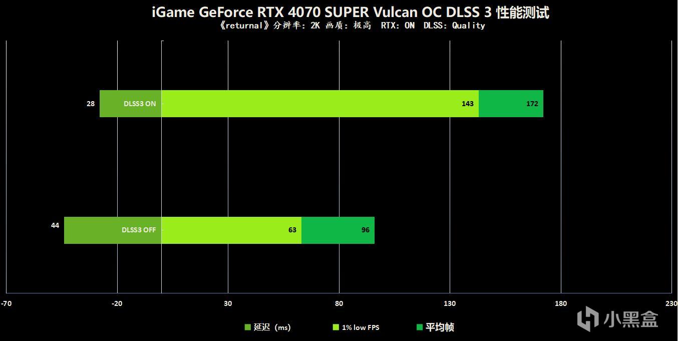 索尼第一方动作游戏《Returnal》在登录PC后也支持了DLSS 3,开启DLSS 3后的帧数提升依旧十分明显,1440P开启光追后从100帧出头来到了172帧整整70多帧的夸张提升,延迟也下降了16ms,在激烈的战斗中更加得心应手了。