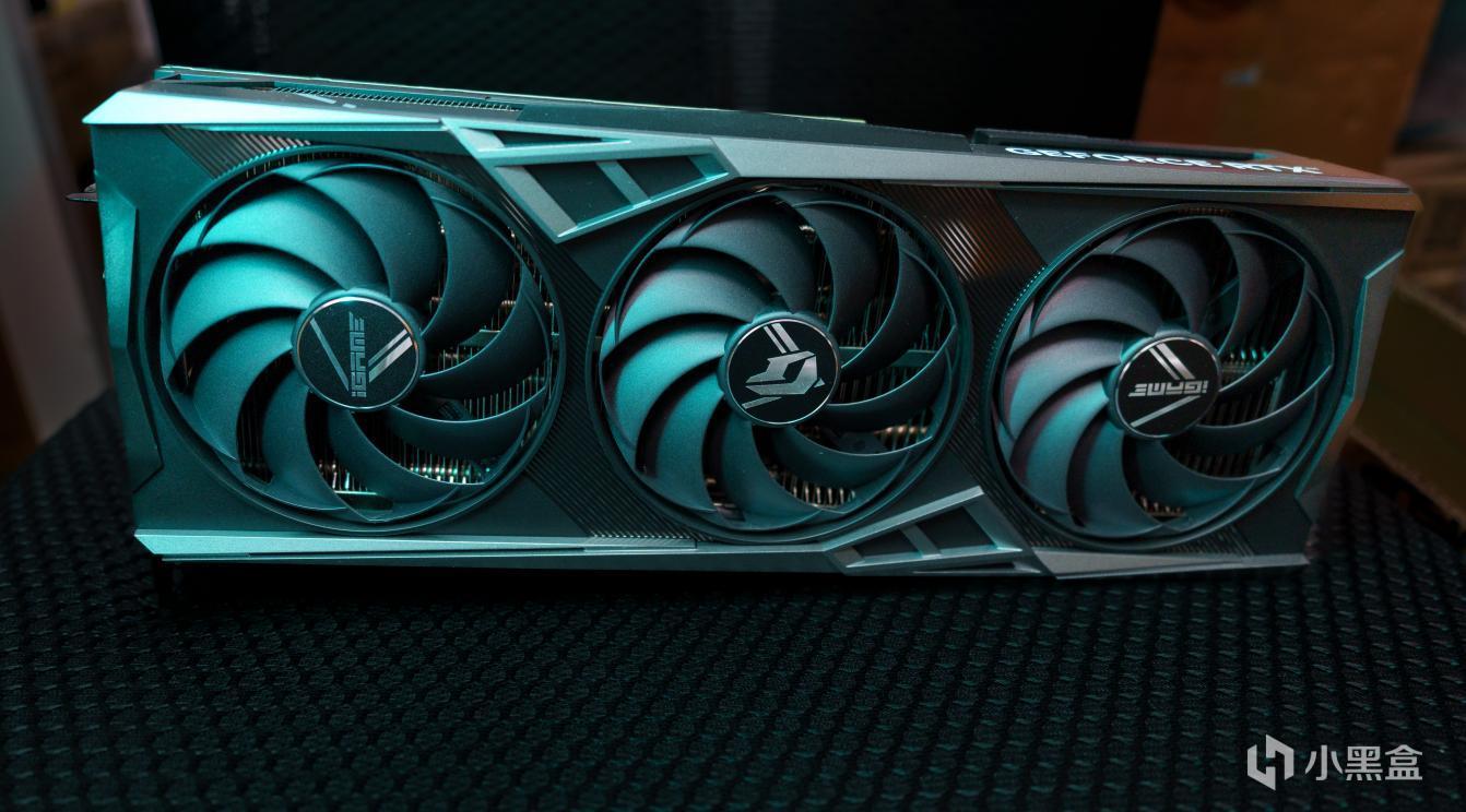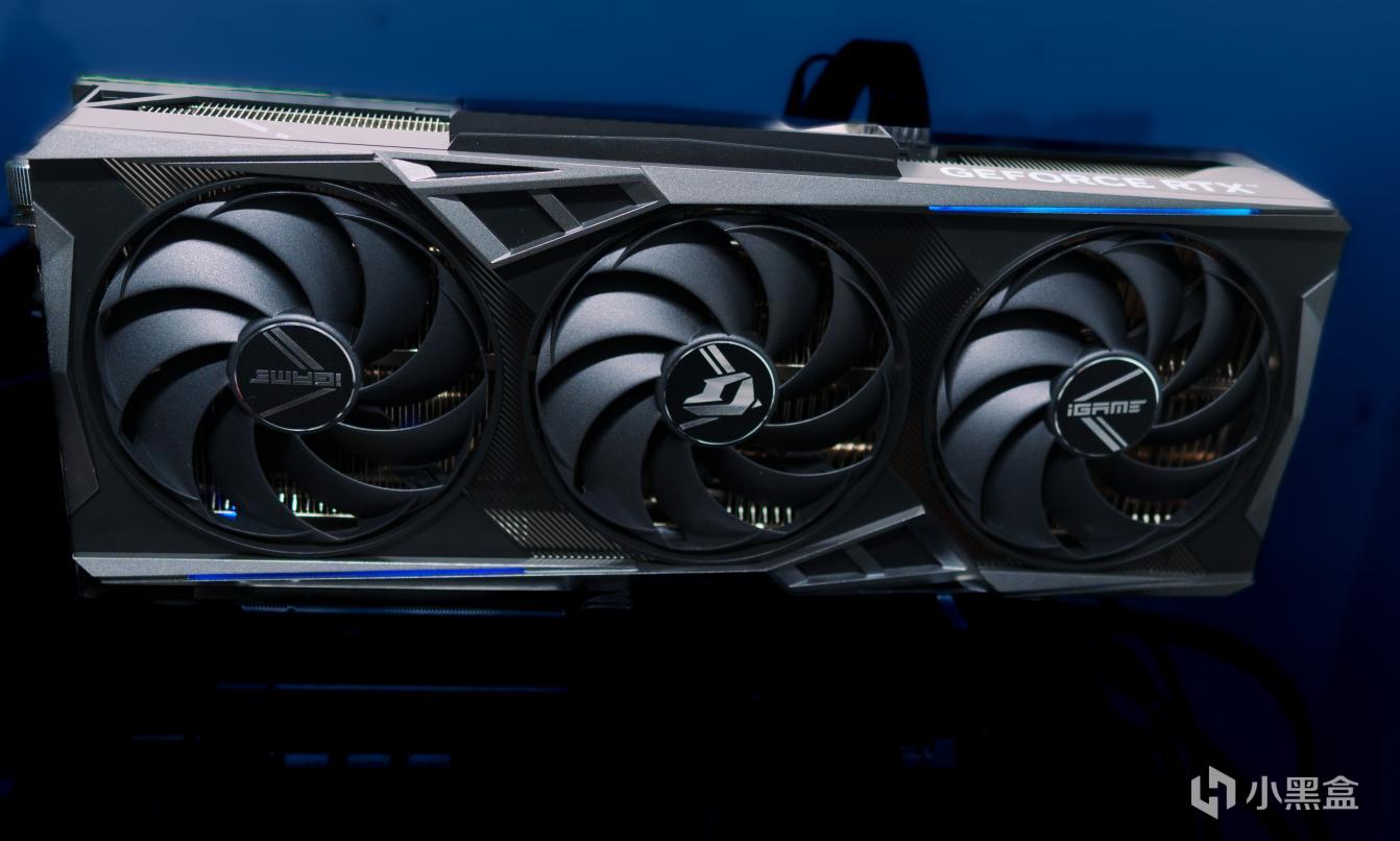 打开显卡本体后,我们就看到了iGame GeForce RTX 4070 SUPER Vulcan OC 12GB的硬核外观,这款显卡依旧是延续了火神系列硬朗棱角分明的“赛博科技风”,充满了数码科技未来感,正面极具机甲质感,黑色配合银色条纹高级感十足,RGB点亮后更是引人注目。