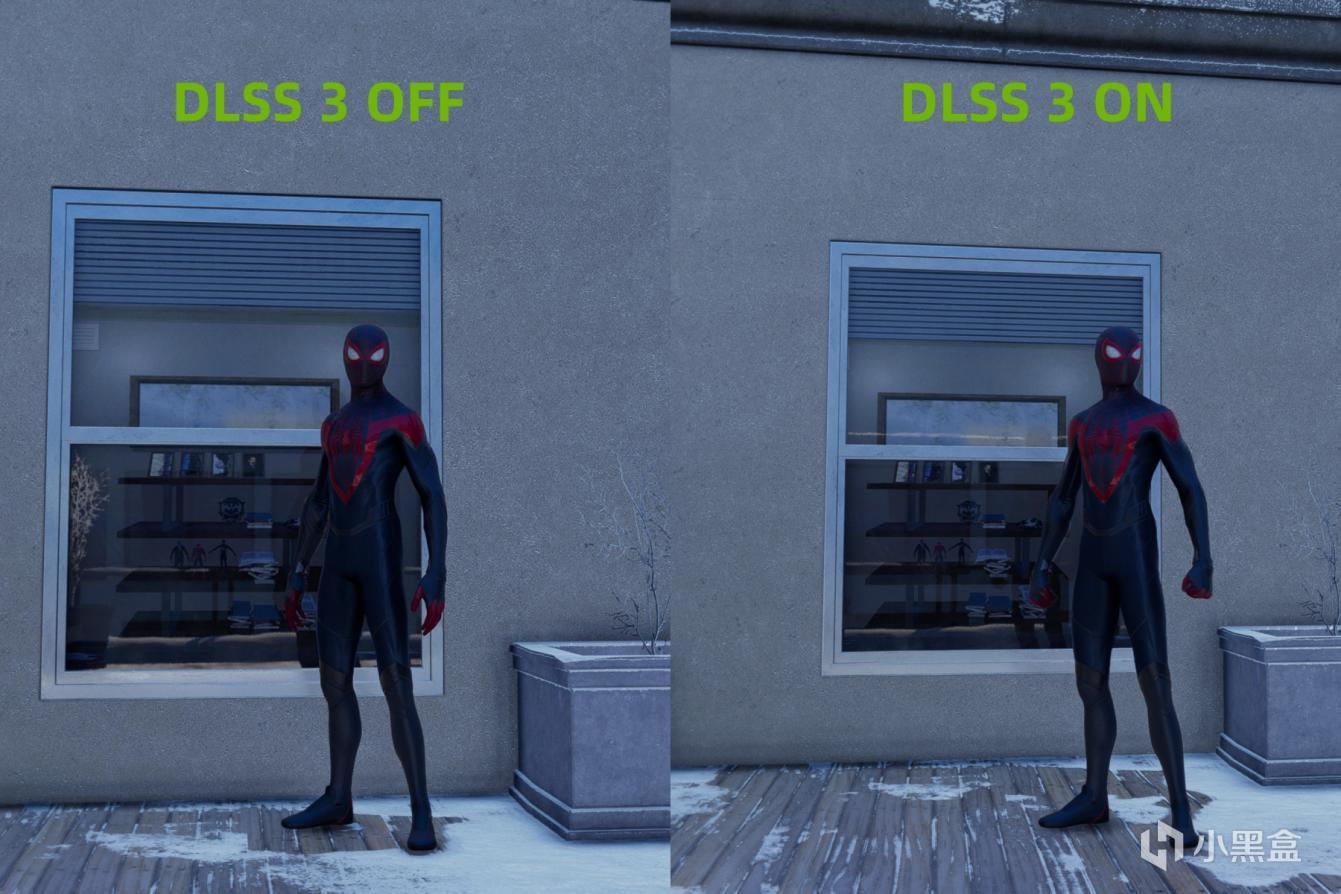 对比开启关闭DLSS 3,我们看到蜘蛛侠的皮肤细节在DLSS 3开启后更加精细锐利,边缘的锯齿也大大减少了,场景的细节也得到了很好的保留。