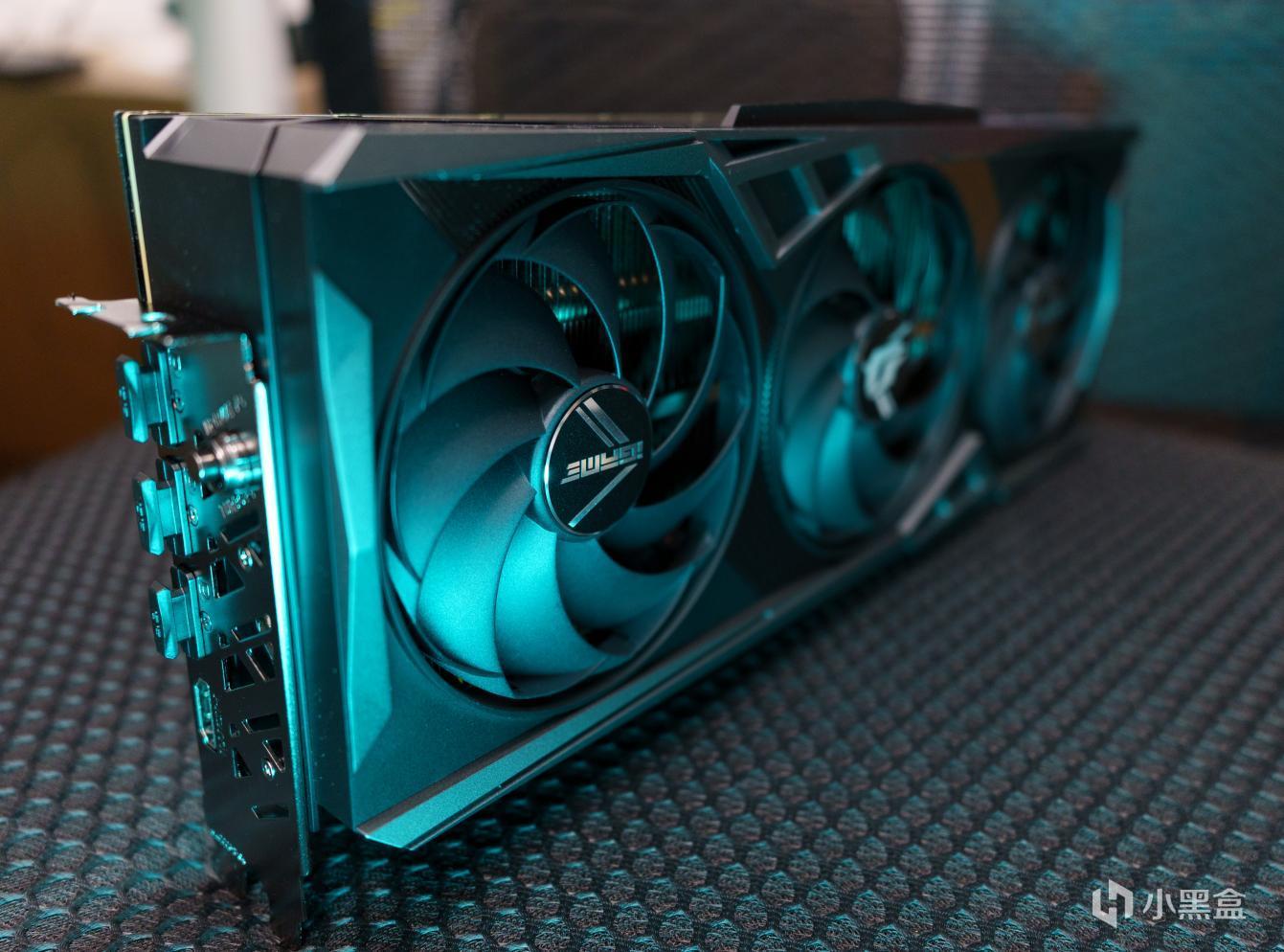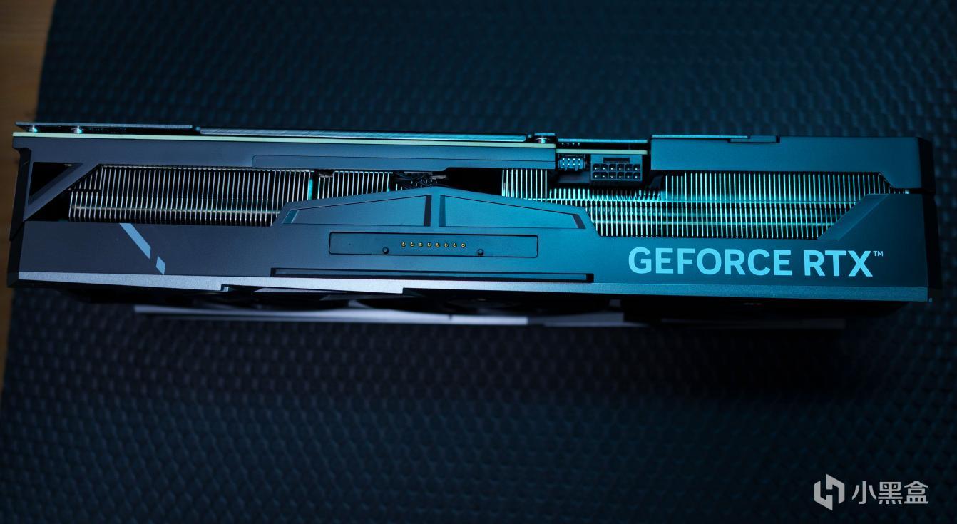 而在背板上我们看到了十分具有赛博气息的设计,三角形锐利分明,背后开窗还能进一步增加散热,配合坚实的合金压铸中框让整个显卡牢不可破。