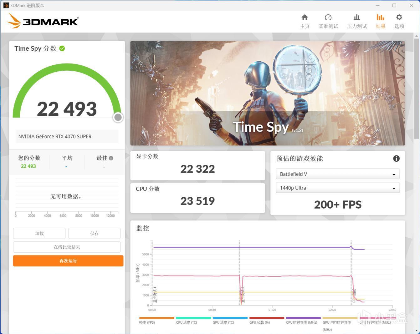 在3D Mark中的DX 12渲染项目Time Spy测试中,我们的iGame GeForce RTX 4070 SUPER Vulcan OC 12GB依靠超强的超频模式达到了恐怖的22322分!这个分数已经非常接近RTX 4070 Ti了,远远高于RTX 4070,不得不说RTX 4070 SUPER的性能还是非常给力的。
