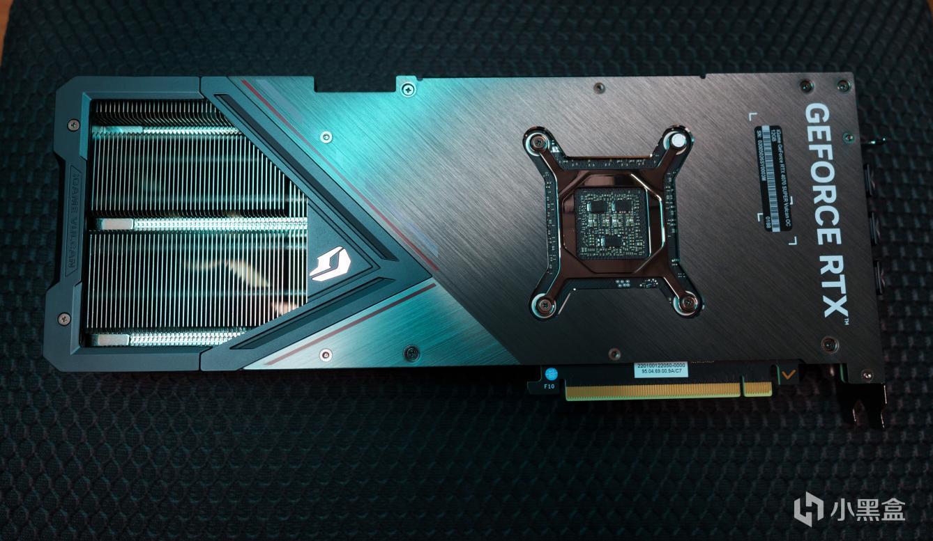 在显卡的侧面我们发现供电接口沿用了40系的16PIN设计,还能看到非常厚实的散热片,iGame GeForce RTX 4070 SUPER Vulcan OC 12GB在散热片上采用了4*6mm+2*8mm热管设计,并且还使用了“真空冰片技术”增加散热量,加厚的倒流型鳍片可以更快的加速拍热,“漩涡”散热配置非常豪华。