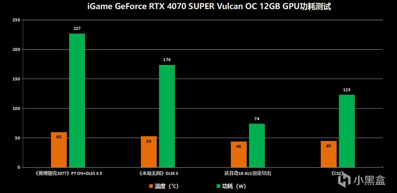 得益于强大的散热配置支持,我们的iGame GeForce RTX 4070 SUPER Vulcan OC 12GB在所有项目的测试中温度均没有超过60°,整个过程十分清凉,并且这一代的RTX 4070 SUPER在功耗方面也十分优秀,运行《赛博朋克2077》路径追踪时只有227W左右的功耗,输出AV1格式更是仅需74W,运行电竞网游《CS2》时的功耗也只有100多瓦,所以玩家们也可以放心升级显卡,不用担心电源不够的问题了。